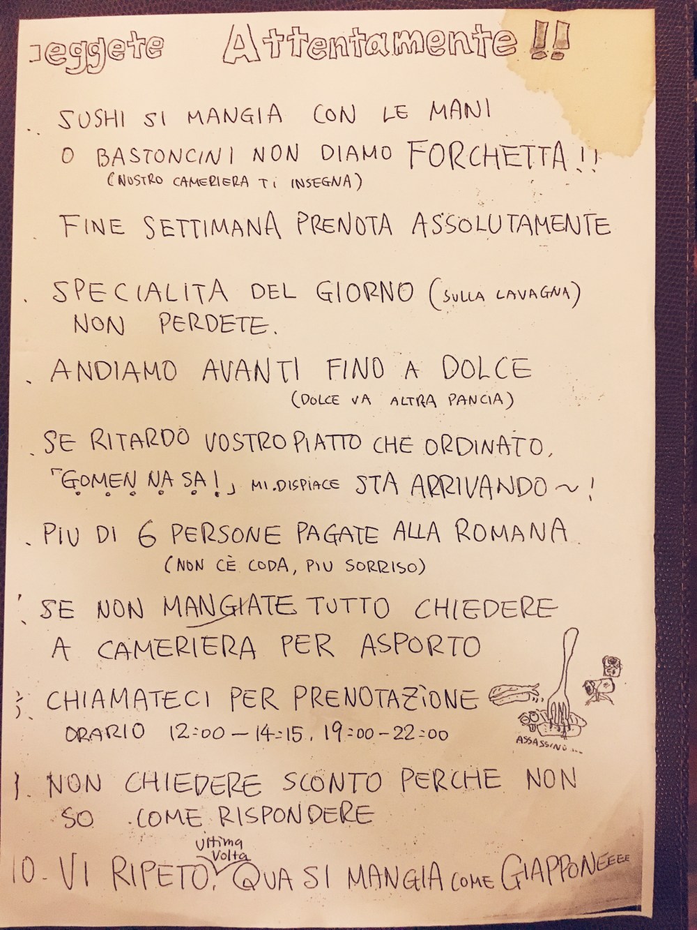 Ci viene consegnato il menù, che nella prima pagina presenta un foglio con i 10 comandamenti dello Chef Yoji.