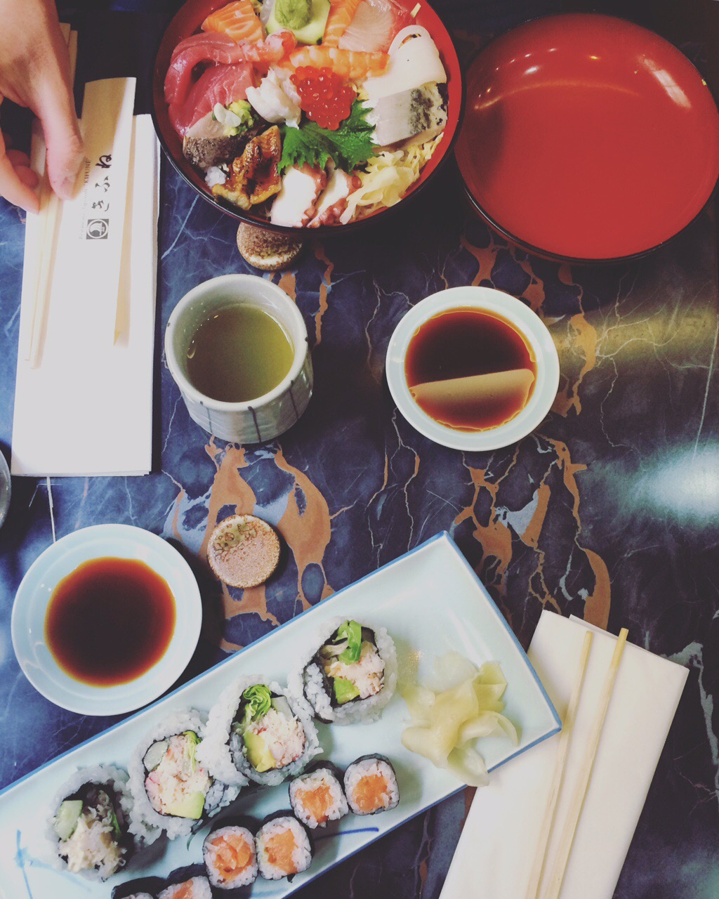 Come prima cosa prendiamo il Chirashi, probabilmente uno dei più buoni mai mangiati; salmone, tonno, gambero cotto e crudo, polpo, anguilla, sgombro, orata, calamaro, uova di salmone. Probabilmente ne abbiam dimenticato qualcuno. Poco importa, il pesce è davvero freschissimo.