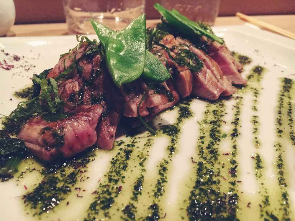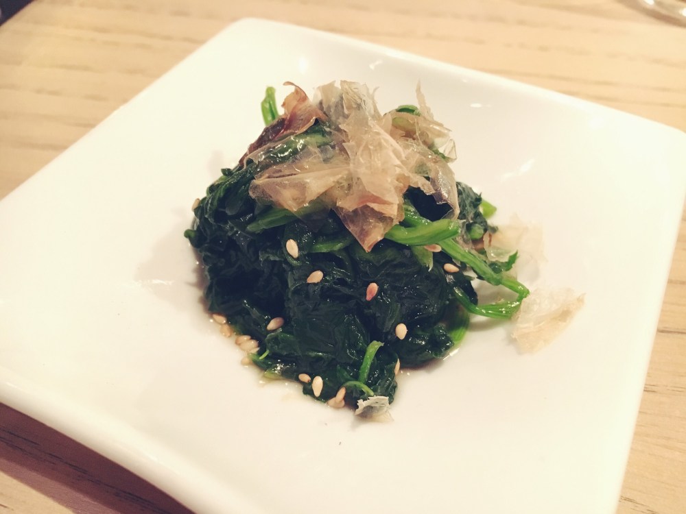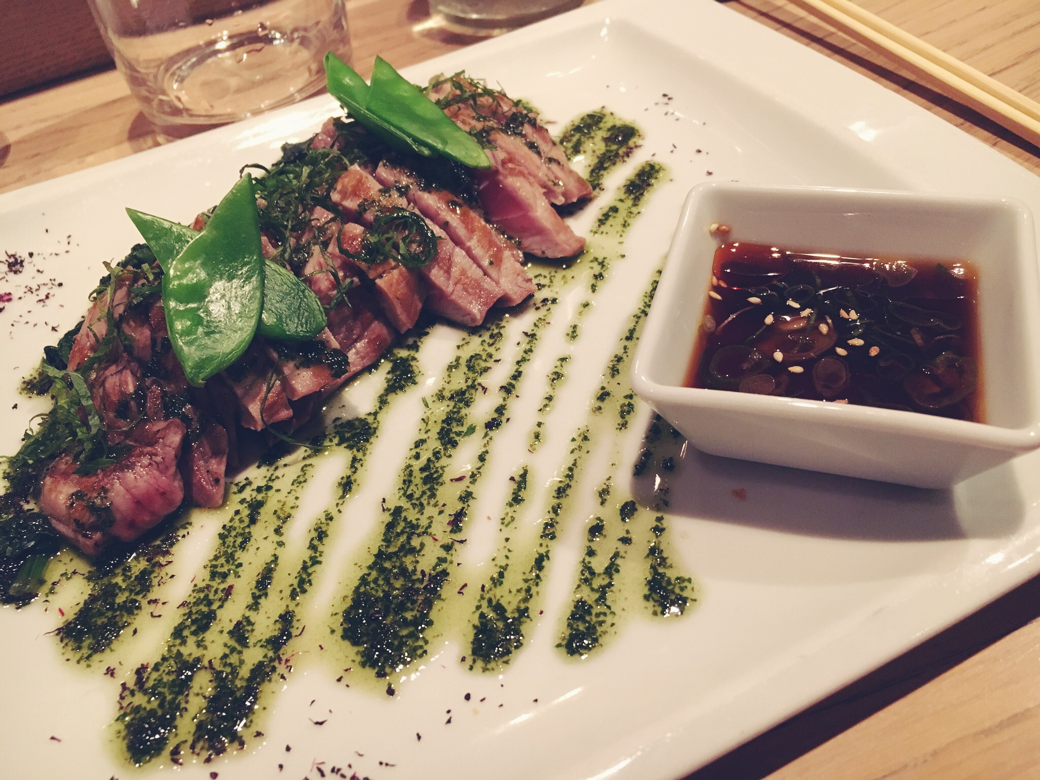 Come prima portata ordiniamo un piatto consigliato proprio dal cameriere che ci ha servito: Filetto di Tonno Amiyaki in Salsa Ponzu Iayu. Appena scottato, morbido e con all’interno il cuore rosso. Base di Spinaci, Salsa allo Shiso (che è una specie di Basilico coltivato in Giappone e in Asia ) e a parte la Salsa Ponzu. Il pesce assume tre sapori differenti: uno se mangiato da solo, un altro se cosparso della Salsa di Shiso e un altro ancora se immerso nella Ponzu: piatto ottimo.