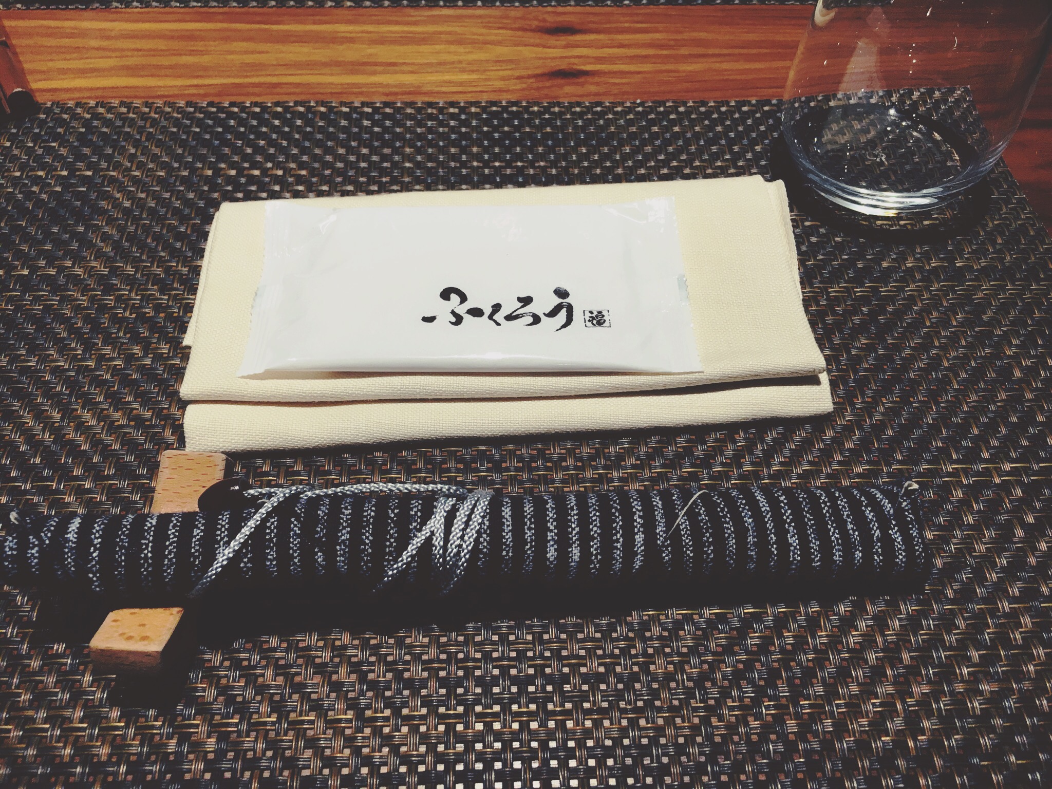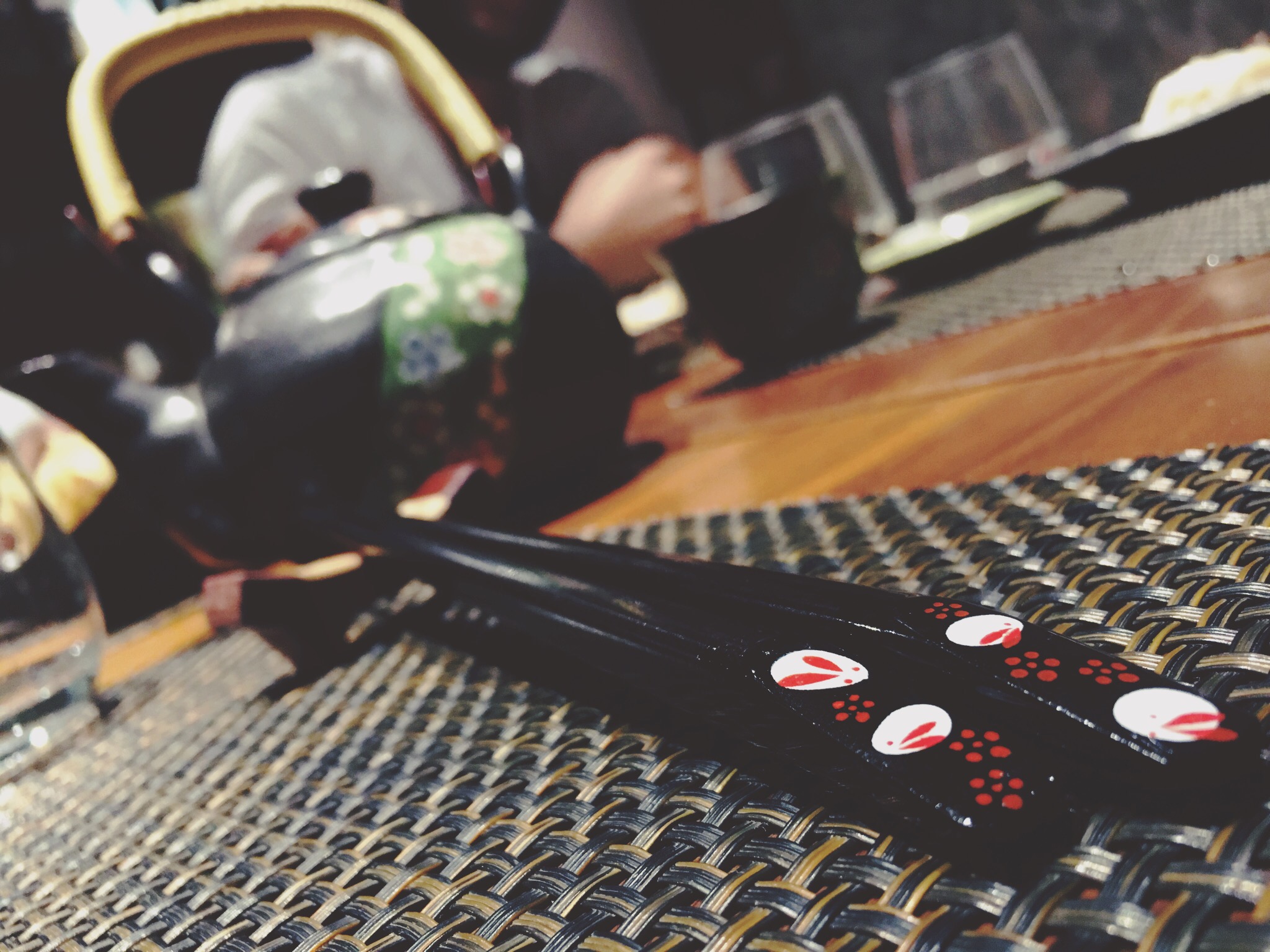 La tavola é molto minimale, con oshibori e le classiche hashi, che abbiamo sostituito con le nostre portate da casa.