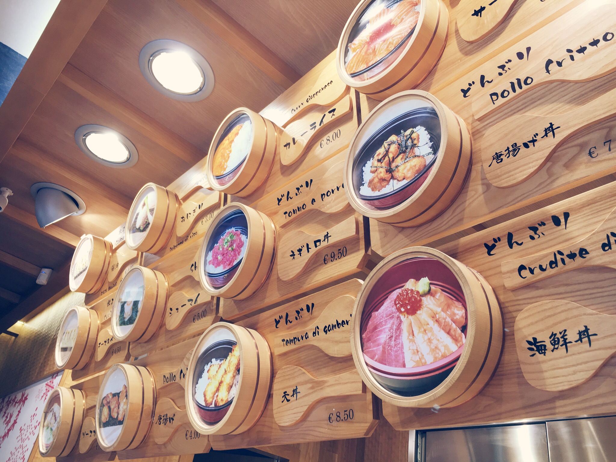 Per ordinare ci dirigiamo verso la cassa. Tutti i piatti sono elencati nella parete di fronte a noi con foto esemplificativa e la rigorosa traduzione in giapponese.