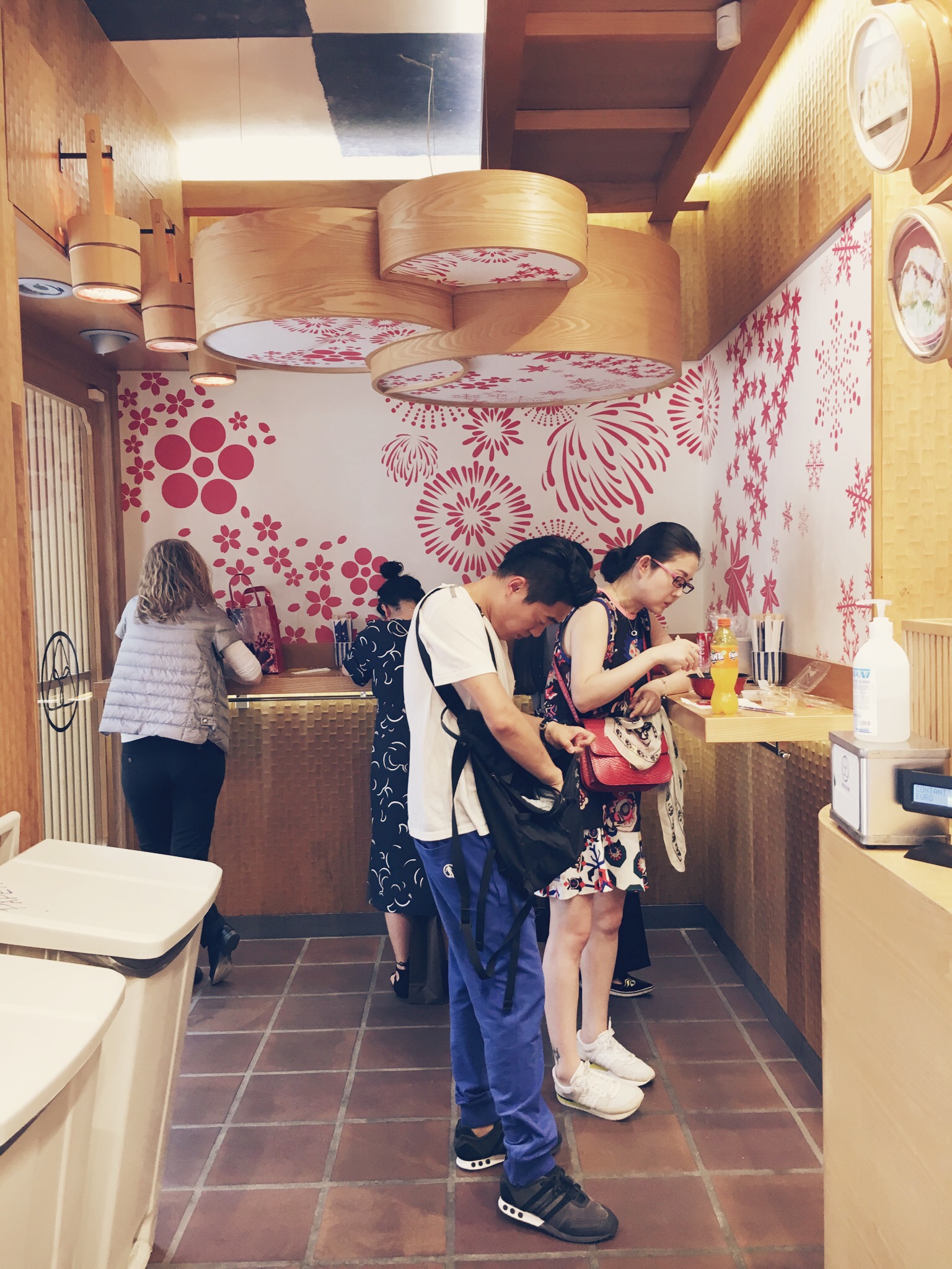 Ordiniamo tutti i piatti lasciando il nostro nome per far sì che ci informino nel momento in cui sarà tutto pronto. Nel frattempo ci ritagliamo un angolo di mensola per mangiare.