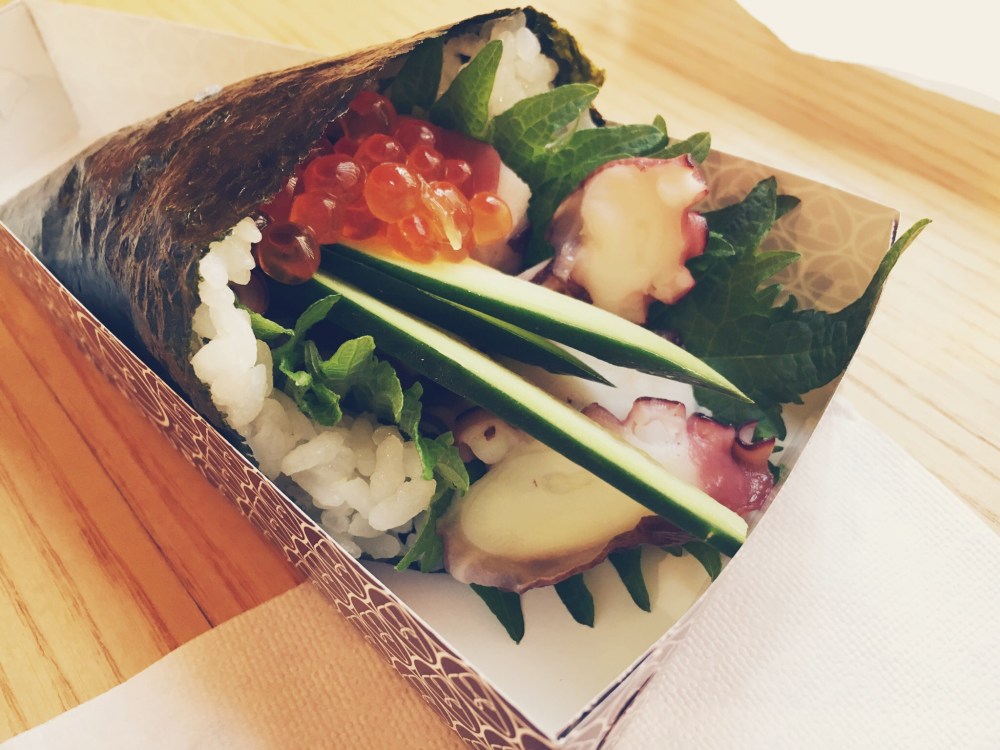 Il secondo invece è il Temaki Sampei, composto da Polipo, Uova di Pesce, Cetriolo e Shiso.