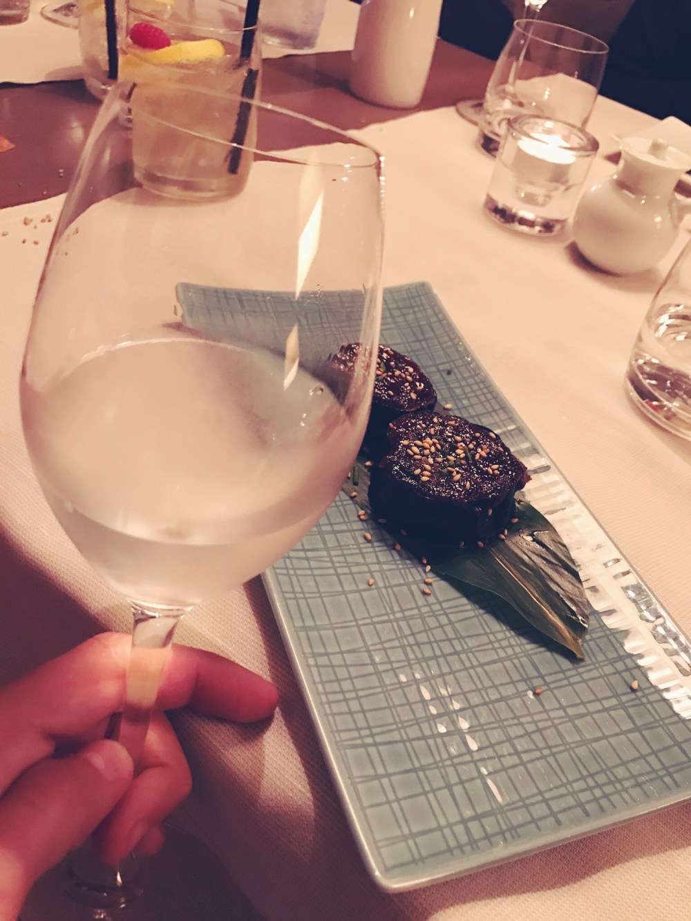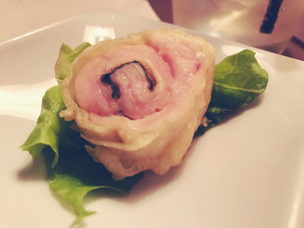 Partiamo con lo Yamagata Tonic, un cocktail di benvenuto, a base di Kimoto Junmai Sake, Tonica al Sambuco, Umeshu (Liquore alla Prugna), Bitter alla Prugna e Succo di Yuzu, per accompagnare un’entree di Tempura di Pollo, Prugna Ume e Shiso.