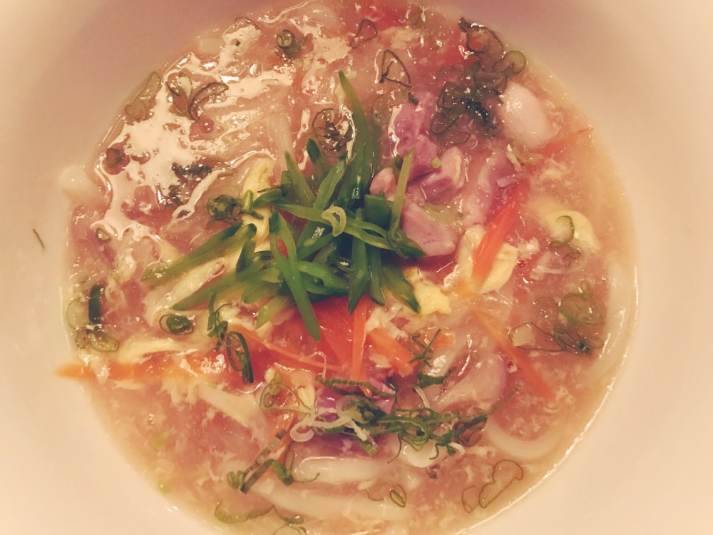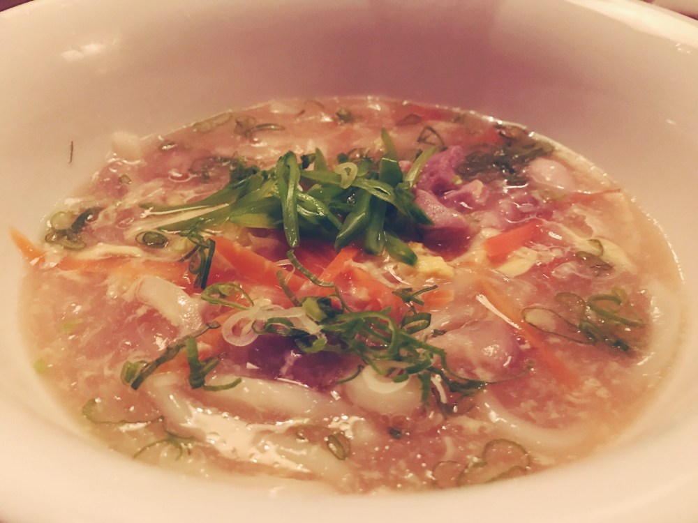 La quarta ed ultima portata non viene abbinata a nessun Sakè ed è il Mini Gomokuankake Udon, un’appetitosa pasta in brodo con pollo, uova, verdure con base di Salsa composta da Dashi, soia, Mirin e Sake.