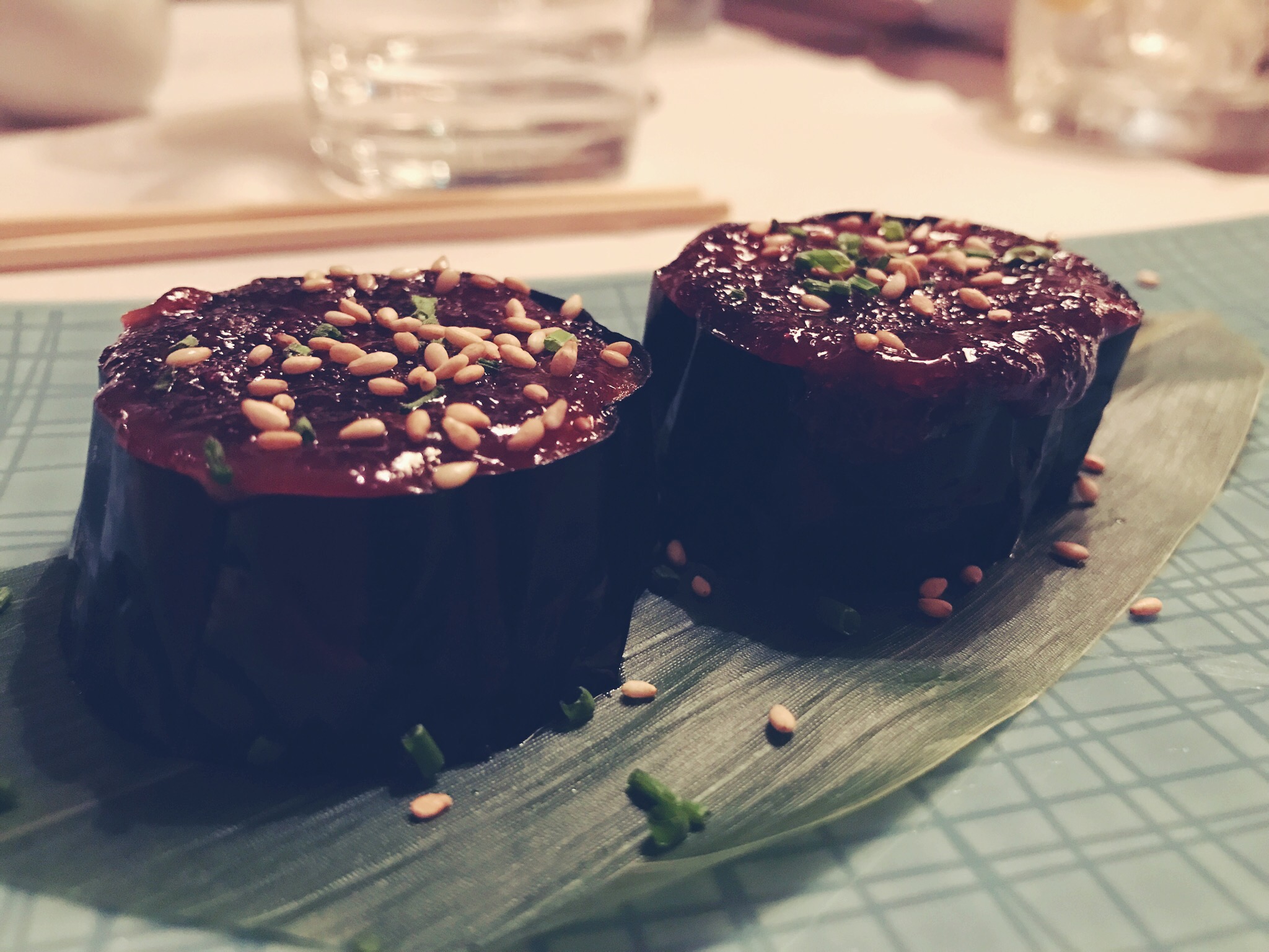 La differenza in questa piccola entree la fanno il sapore particolare dello shiso (per chi non lo sapesse è una sorta di basilico orientale) e della prugna, che da la componente dolce che si sposa molto bene con il resto.