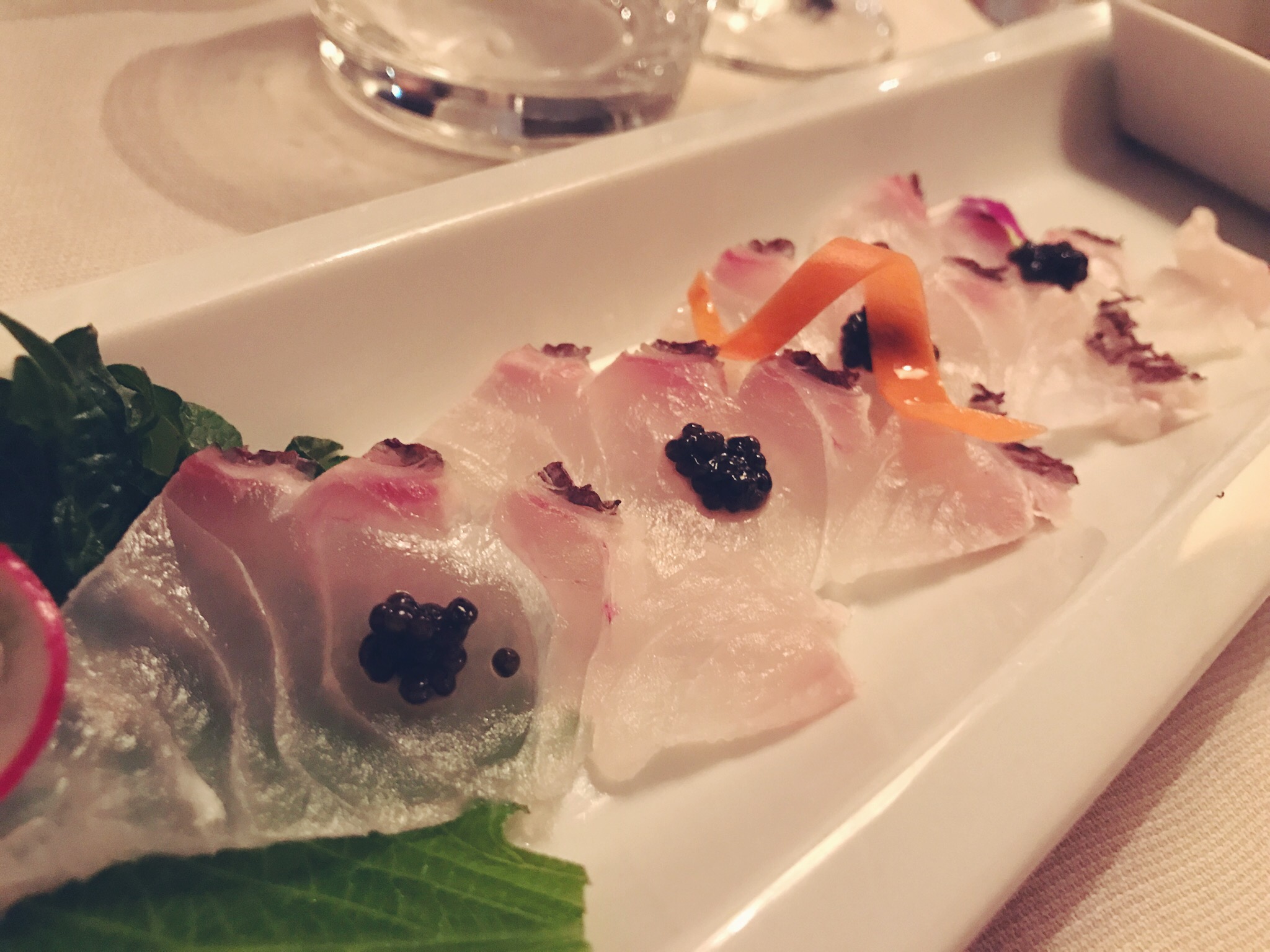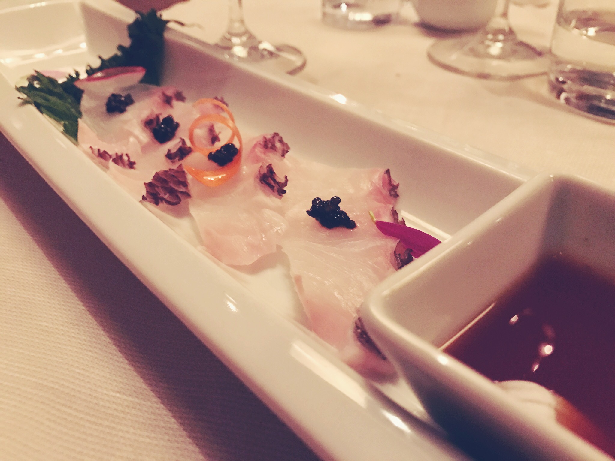 Il nome è Matskawa Sukuri perché viene lasciata la pelle. Sopra i filetti il fantastico caviale. A parte la Salsa yuzu e Soia.
