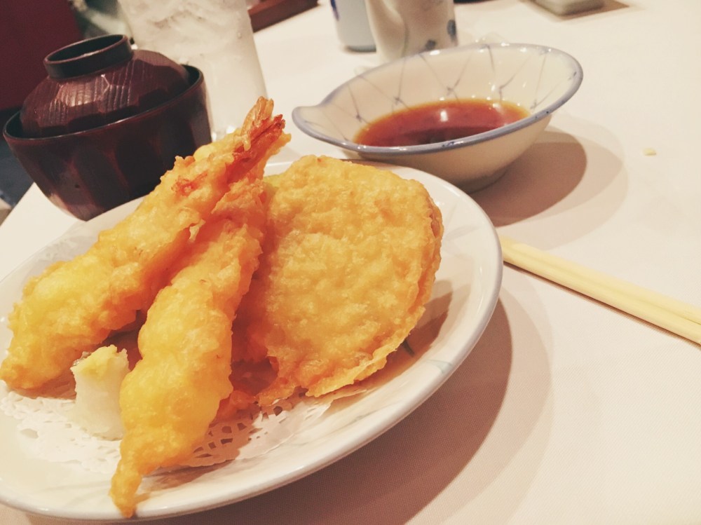 La prima portata che ordiniamo è la Tempura di Gamberi e verdure, che dividiamo nel tavolo nell’attesa del sushi.