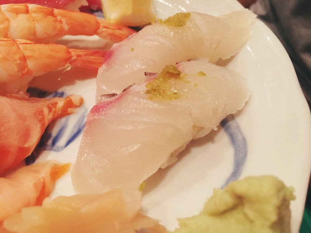 Poi è il turno del Sea Bream, il Nigiri con filetto d’Orata e del Shrimp, con Gambero cotto.