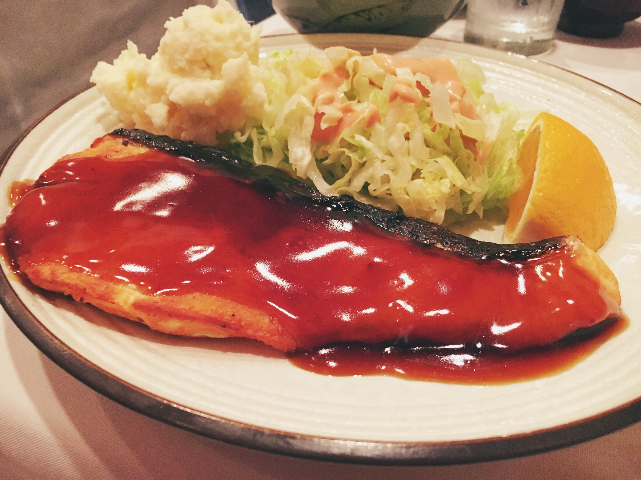 È il momento dei piatti principali. Il primo è il Salmon Dinner, un morbidissimo filetto di Salmone al forno ricoperto completamente da salsa Teryaki, affiancato da un insalatina verde e un’insalata di patate, per non scostarsi troppo dalle abitudini americane.