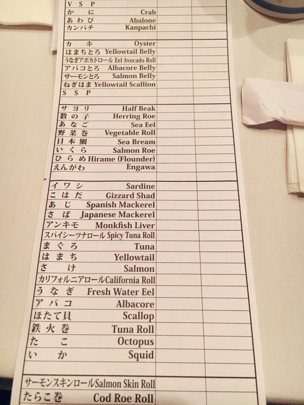 Poco dopo arriva è il turno dei Nigiri, che scegliamo e crocettiamo direttamente noi da una lunga lista allegata al menù, proprio quella sulla quale è possibile ordinare al bancone.
