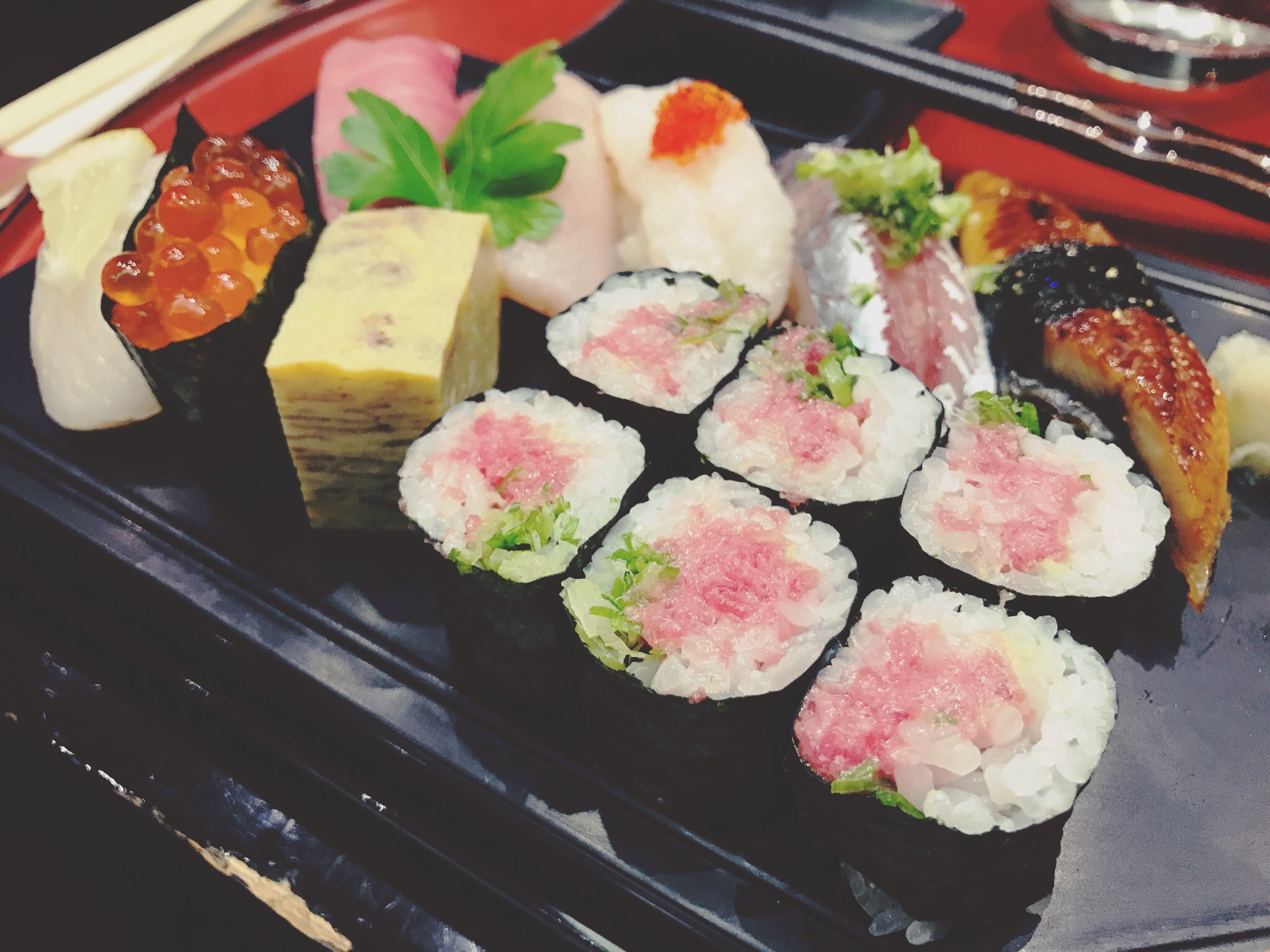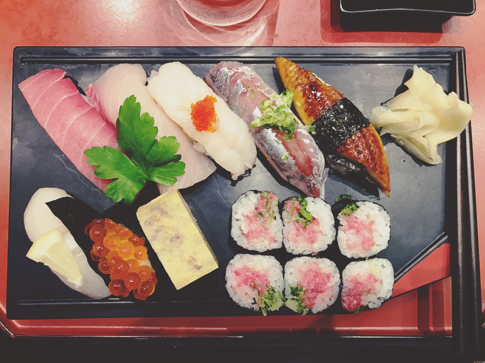 Come al solito rimaniamo incantati dall’aspetto estetico del piatto. Iniziamo dalla Tamago, che abbiamo mangiato poco fa. Poi passiamo ai Nigiri, elementi cardine di questa degustazione. Il primo è con l’incredibile Ventresca di Tonno; il secondo con il filetto di Ricciola; il terzo ha come protagonista il Gambero crudo; il quarto è con il Suari (o pesce azzurro), molto a cuore alla tradizione culinaria giapponese; il quinto è con l’Anguilla; il sesto ed ultimo con Capasanta. Poi è il momento del Gunkan con Uova di Salmone e terminiamo con sei Maki di Ventresca e Cipollotto. È una di quelle degustazioni che difficilmente dimenticheremo.
