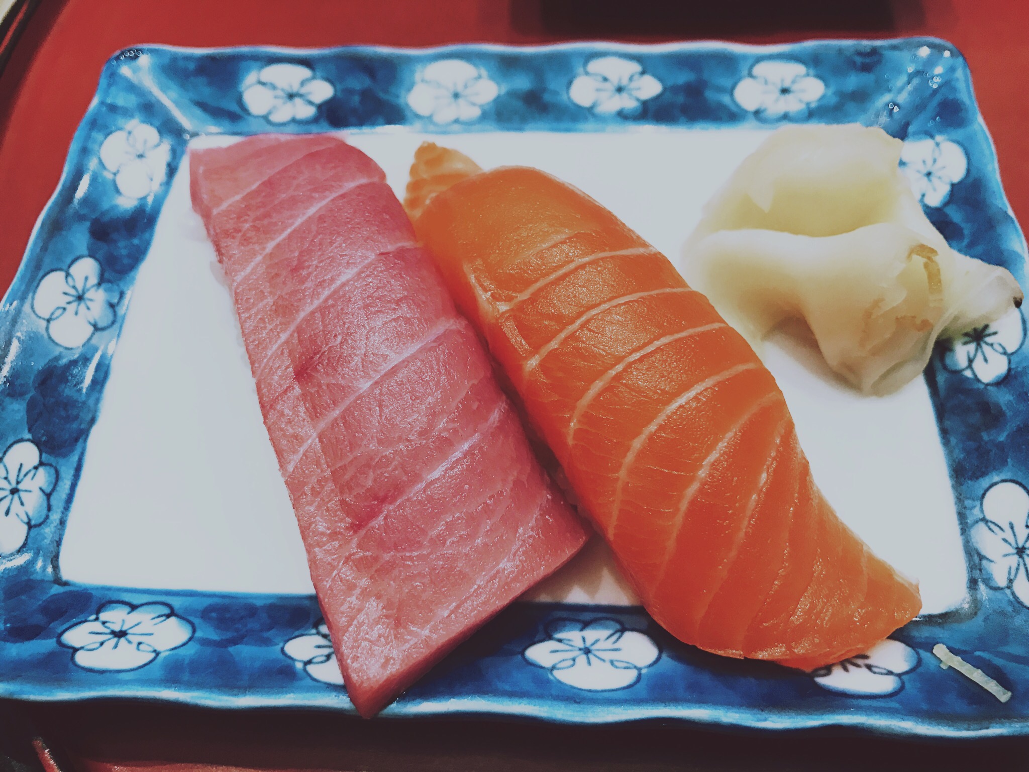 Nel piatto dello chef terminato poco fa uno dei filetti che più ci ha deliziati è la Ventresca di Tonno. Ordiniamo quindi un altro Nigiri Toro e uno con il Salmone (Sake).