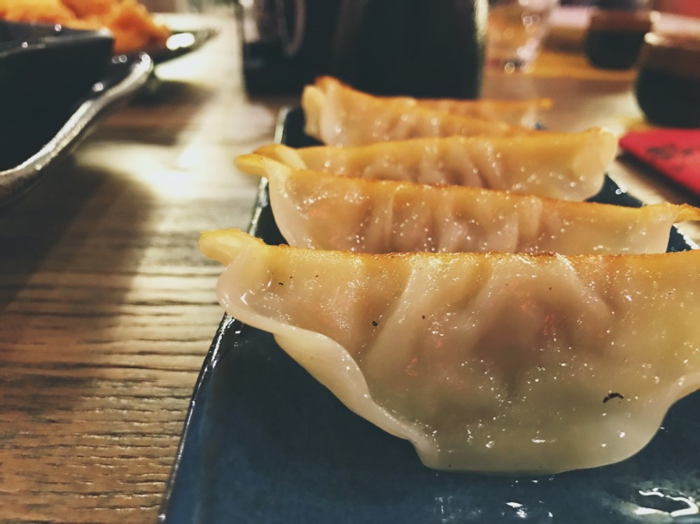 Partiamo con i Gyoza di pollo e verdure, piacevoli se immersi nella salsa di soia.
