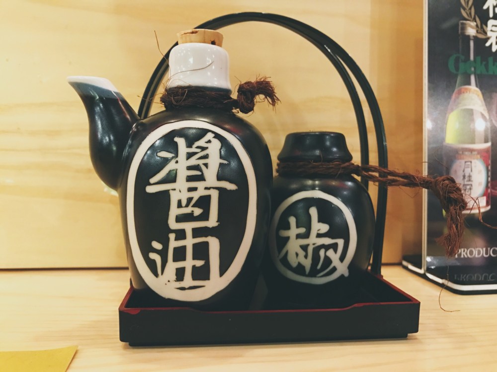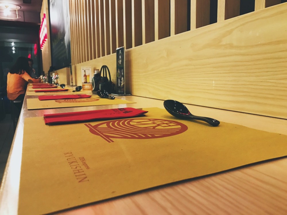 La tavola è apparecchiata simile ad una izakaya (trattoria), con bacchette di legno e un cucchiaio, indispensabile per il ramen.