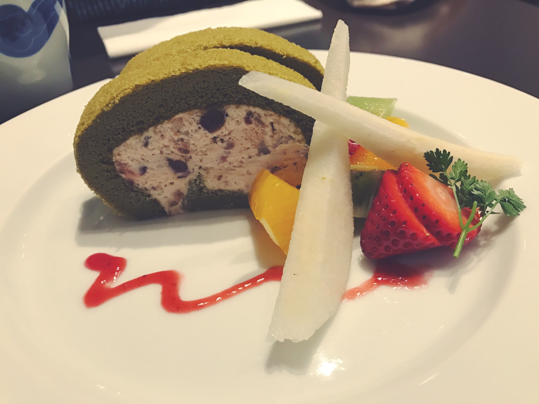 Terminiamo assaggiando un dolce. Tra quelli elencati in menu prendiamo un’ottima Macha roll cake, una torta al Macha con ripieno di crema di Fagioli e servita con qualche pezzetto di frutta.