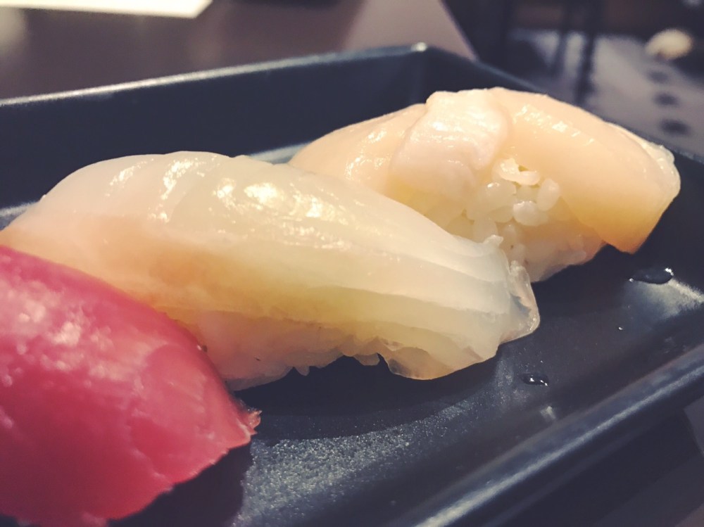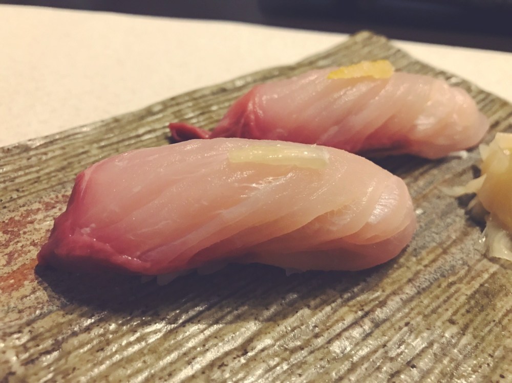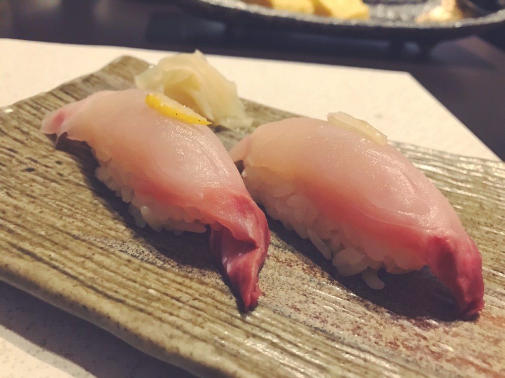 I maestri giapponesi sono soliti porre al di sopra del filetto di pesce un pizzico di verdura, frutta o spezie per insaporire il nigiri. In questo caso lo chef ha pensato ad un filetto di Yuzu, un agrume giapponese, che dona una piccola nota aspra al gusto finale. La ricciola è fresca e la consistenza del pesce la rende quasi croccante. A nostro dire uno dei pesci più buoni.