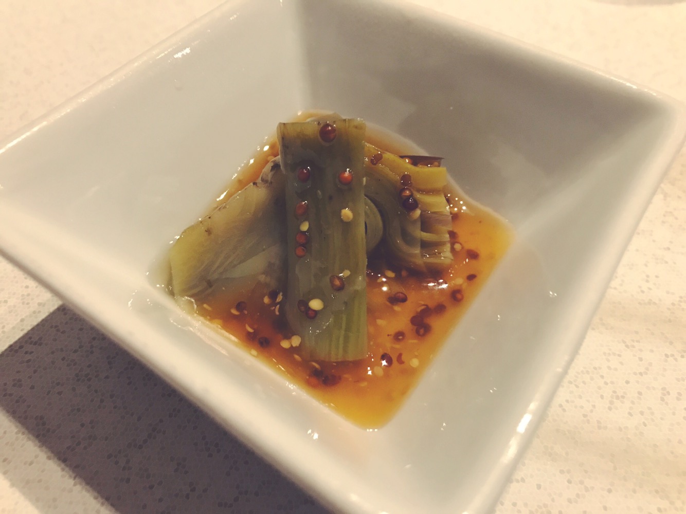 Prima di iniziare il percorso culinario il nostro cameriere di riferimento ci porta al tavolo un’ottima entree composta da Carciofi conditi con semi di Senape e Soia.