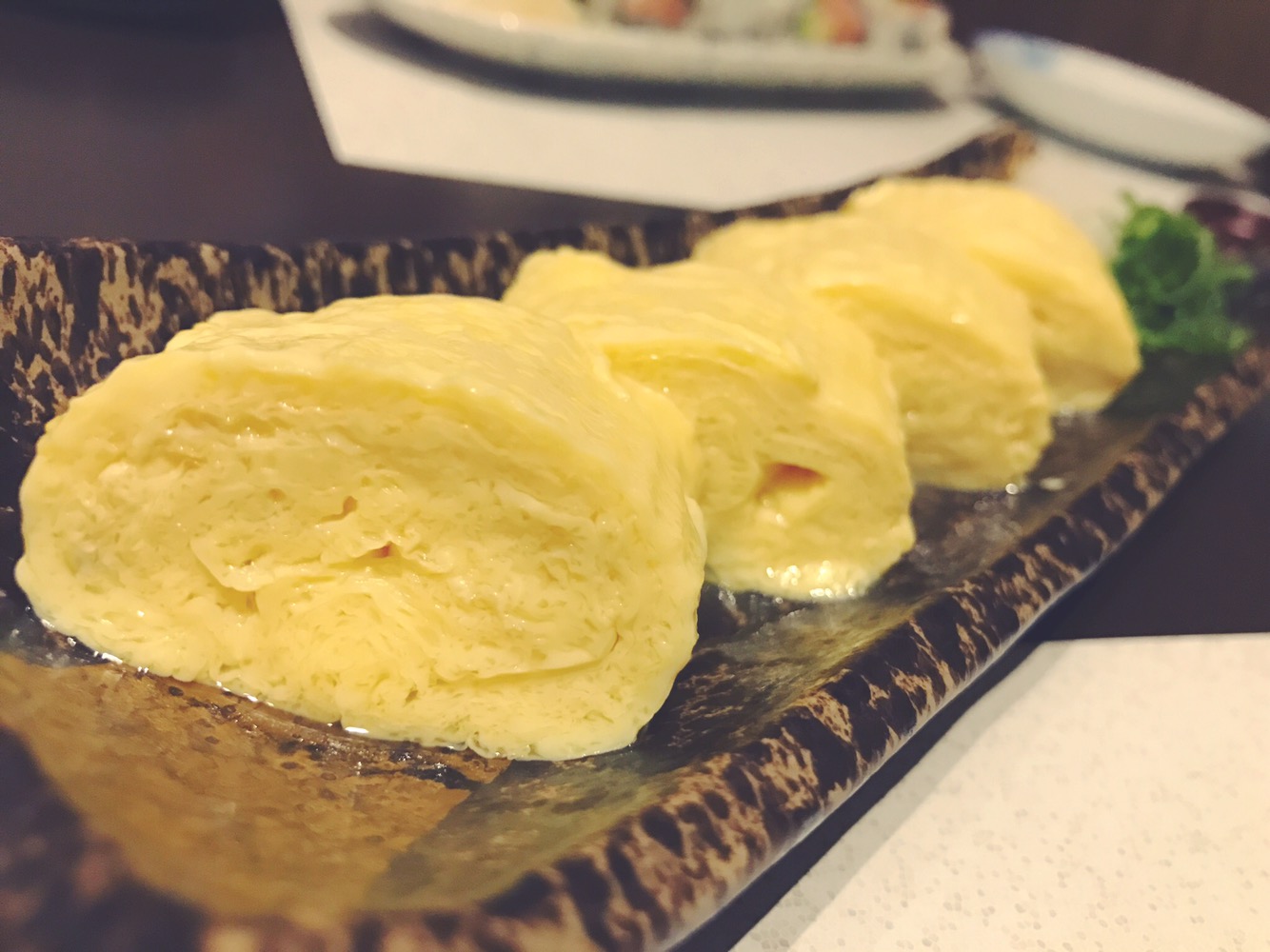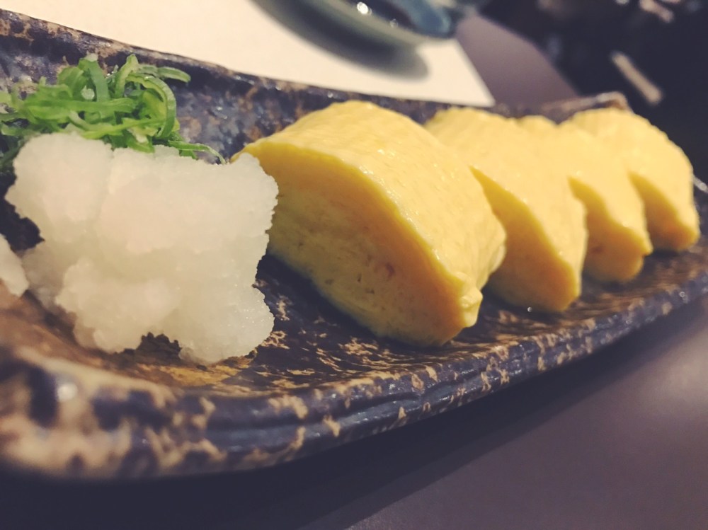 La prima portata che ordiniamo è un tipico piatto giappone e si tratta della Dashimaki Tamago, una frittata alla Giapponese, composta da più strati arrotolati su se stessi.