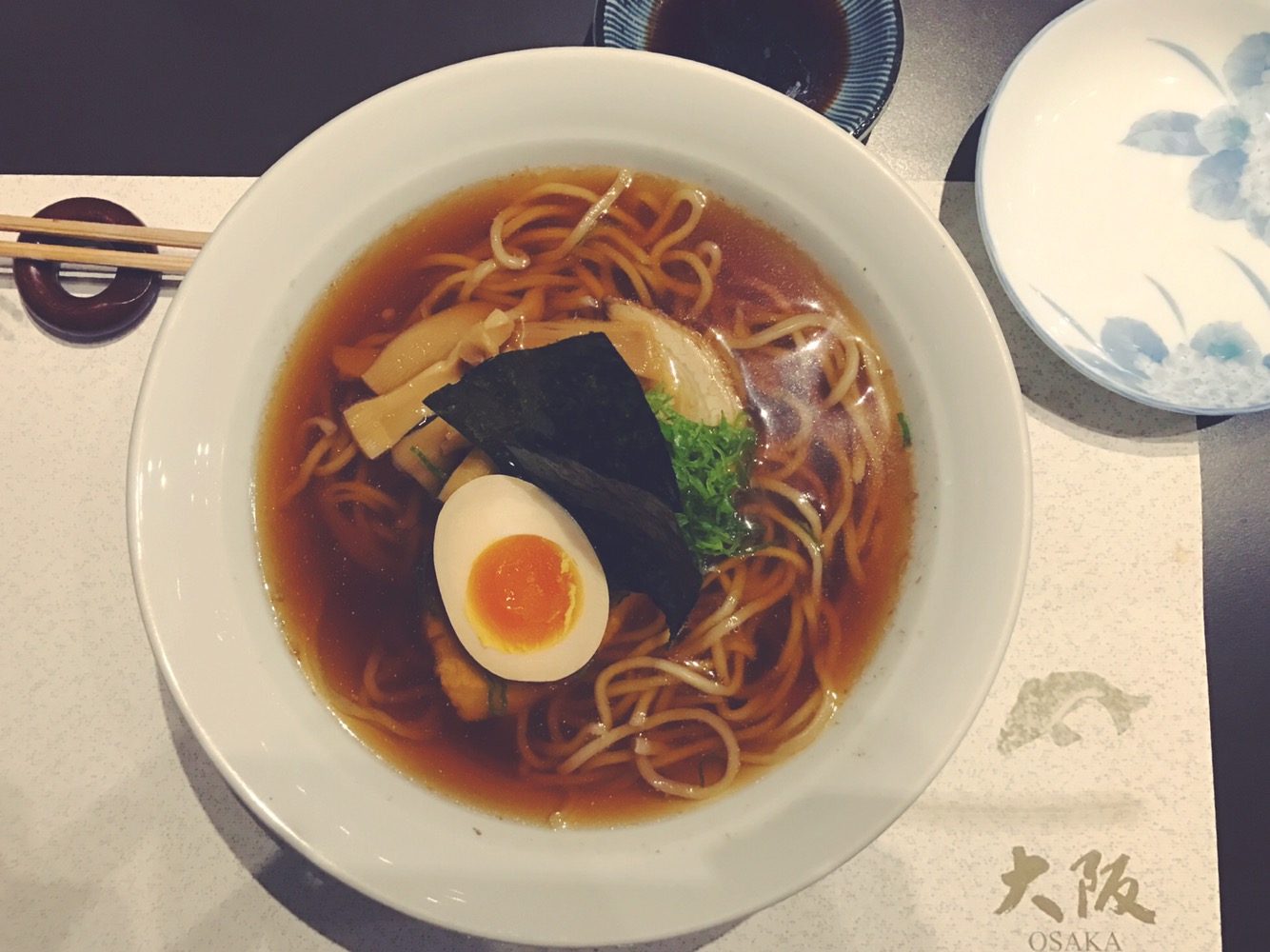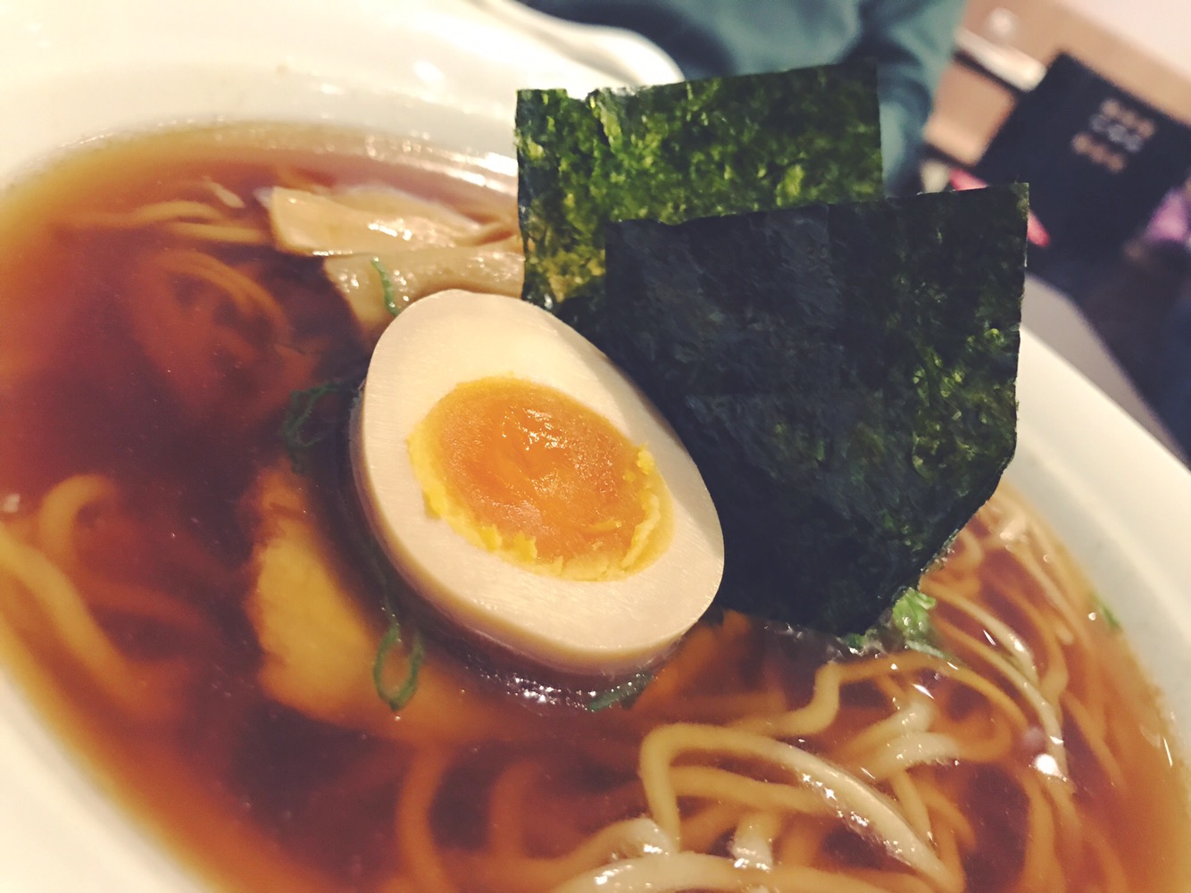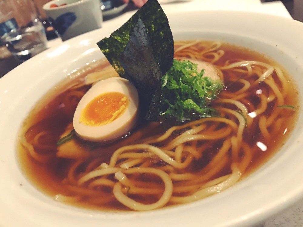 Tra questi ordiniamo lo Shoyu, un ramen in brodo di Carne con Salsa di Soia, Carne di Maiale, Uovo marinato, fogli di Alga Kombu e cipollotto.