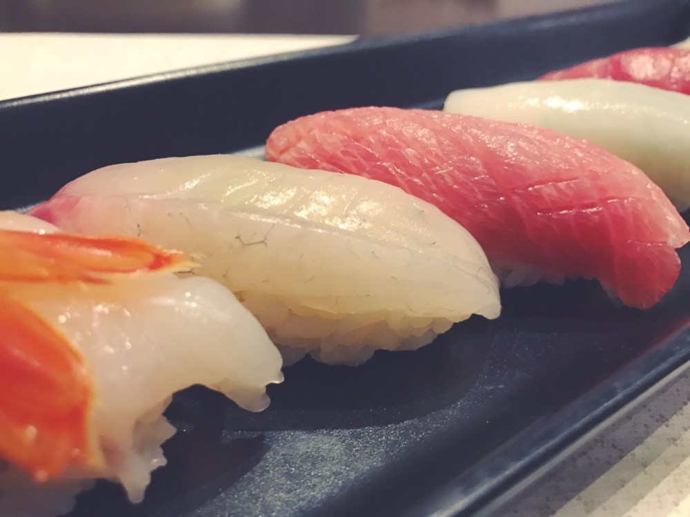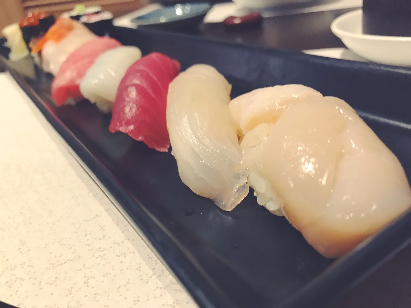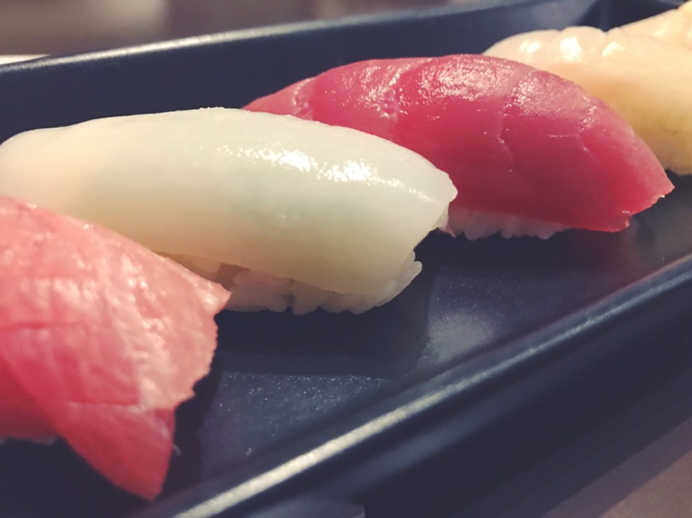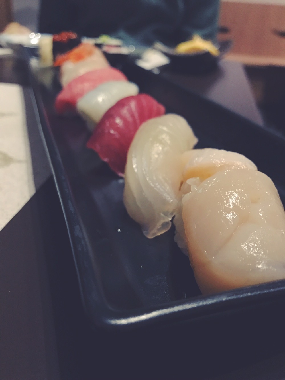 Partiamo dalla bellissima presentazione. I nigiri sono disposti su un piatto lungo nero per risaltare ancora di più l’esplosione di colori delle diverse tipologie di pesce.