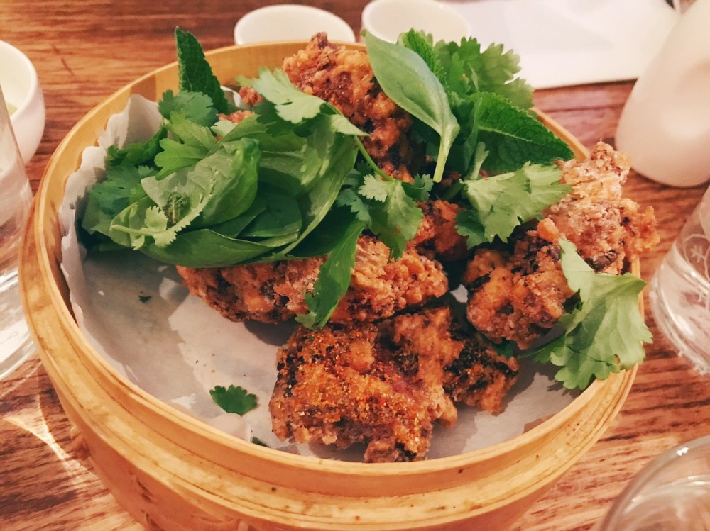 Da un piatto vegano passiamo al Kim Pollo Karage, Pollo fritto, Menta, Coriandolo, Basilico da abbinare ad una Maionese al The Matcha.