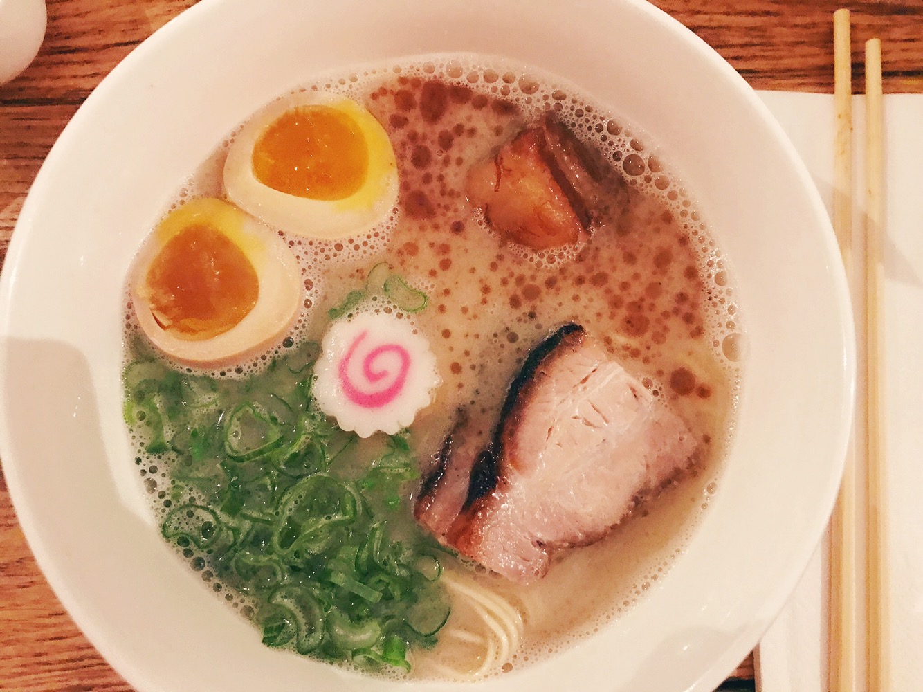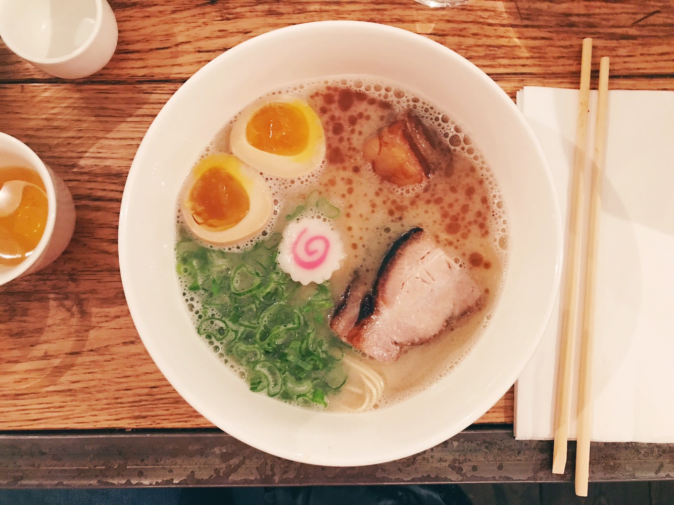 Il brodo è molto gustoso e grazie alla cottura lunga e al maiale, ha una consistenza quasi cremosa. La carne di maiale è grassa 🙂 e tenerissima. Consideriamo uno degli ingredienti piu importanti: la pasta! I noodles sono fatti in casa e la differenza è abissale. Apprezziamo molto anche l’uovo marinato, che abbiamo ordinato come ingrediente aggiuntivo. Come ciliegina sulla torta il classico Kamaboko, la rondella bianca e rosa ottenuta dalla lavorazione di surimi e pesce bianco. Il sapore è ottimo.