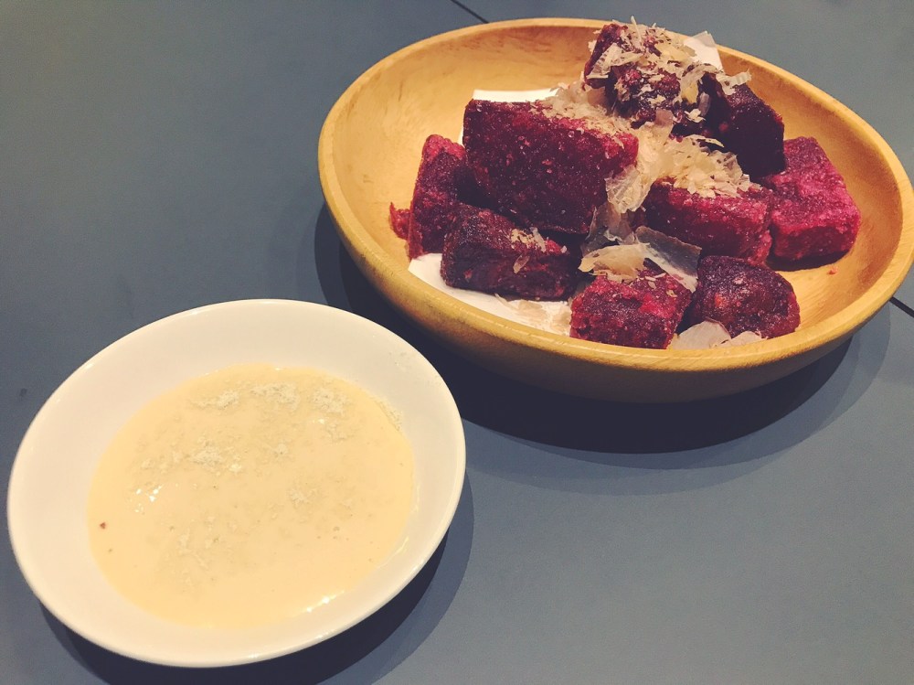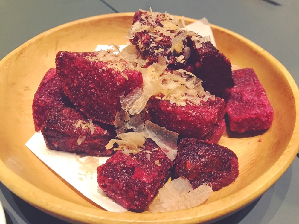 Incominciamo molto bene con delle Rape rosse fritte, maionese allo yuzu, katsuobushi.