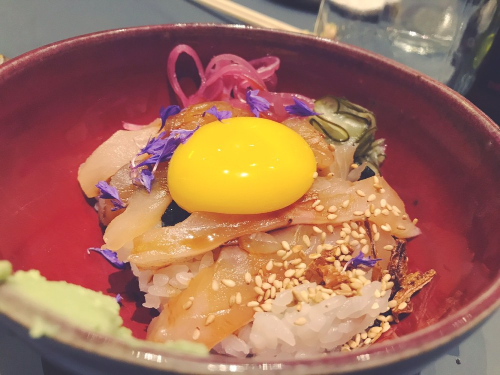 Dal caldo al freddo è il momento del Donburi sashimi con pescato del giorno, ikura, katsuobushi, pickles, tuorlo, fiori.