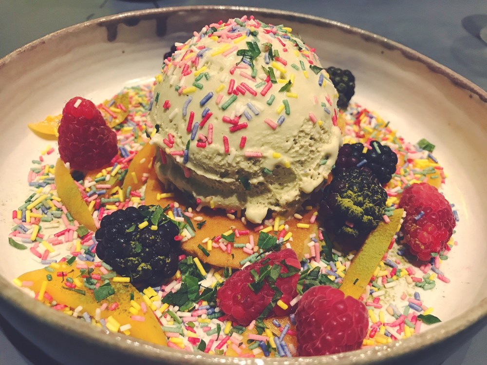 Viene presentato, come dice Luca, in una versione “pop”, quindi in modo differente da come siamo abituati a vedere nei ristoranti giapponesi. Un’esplosione di colori. Pancake, gelato al pistacchio (che ricorda il verde del Matcha), shiso, lamponi, more, caramello al miso.