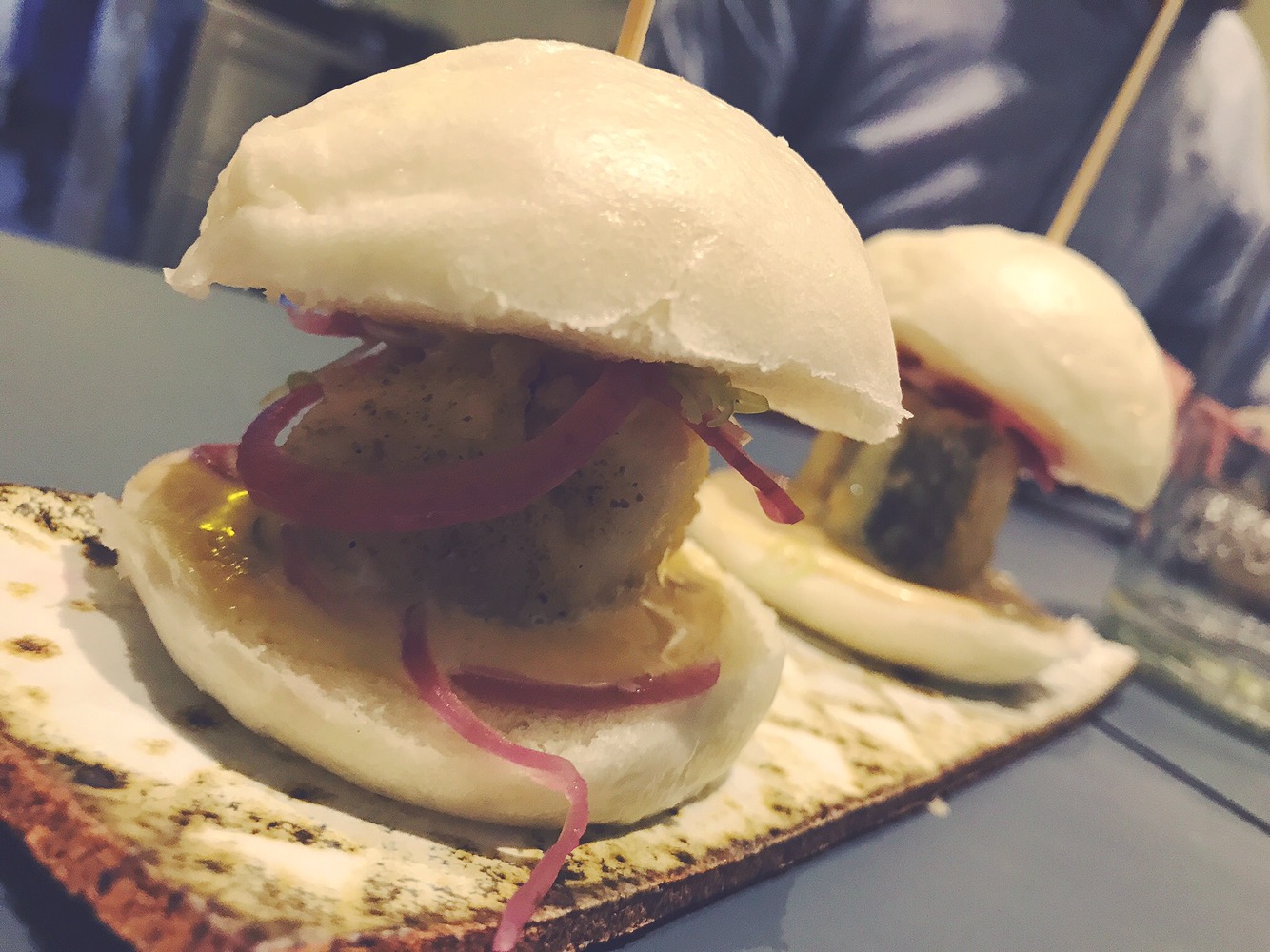 Il secondo è un vero e proprio panino, farcito da Baccalà in tempura, maionese al the Matcha, cipolla in agrodolce. Ottimi!