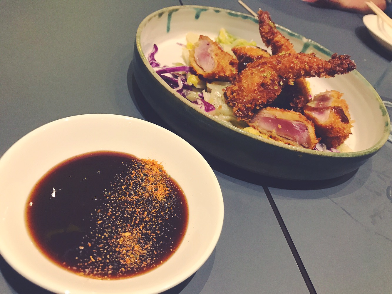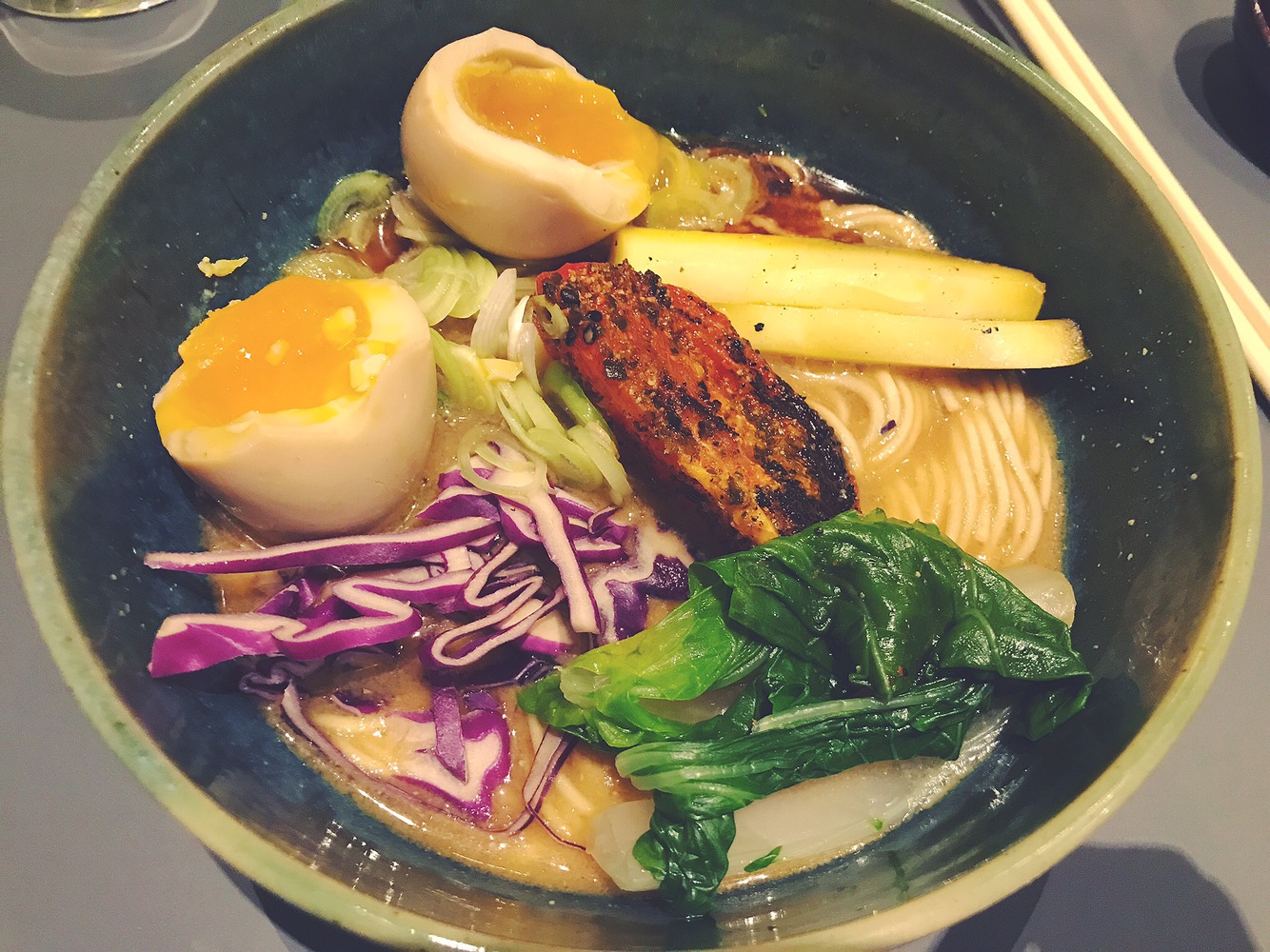 Un’autentica delizia. Partiamo dalle verdure estremamente croccanti e buonissime. All’interno cavolo cinese, peperone, pomodoro e cipollotto. La pasta sottile, fatta in casa fa sempre la differenza. Il brodo, pezzo forte del piatto, e arricchito dal gusto inconfondibile del Miso, che insaporisce e gli conferisce un gusto goloso. Degno di menzione anche l’uovo, sodo fuori e morbido all’interno.