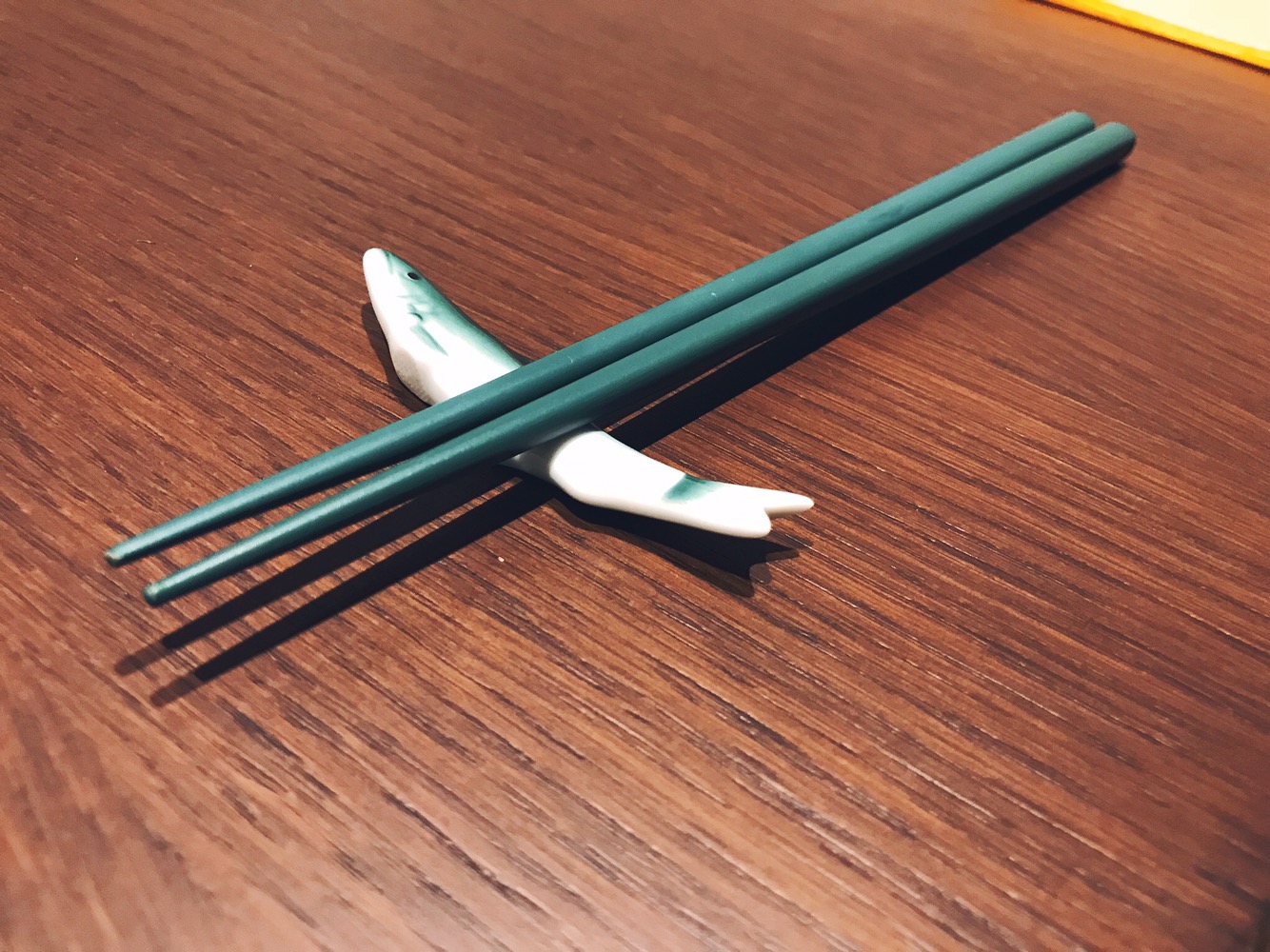 Il tavolo è apparecchiato in modo minimale con tovaglioli gialli in tinta con il pavimento, porta bacchette semplici o a forma di pesce e bacchette opache.
