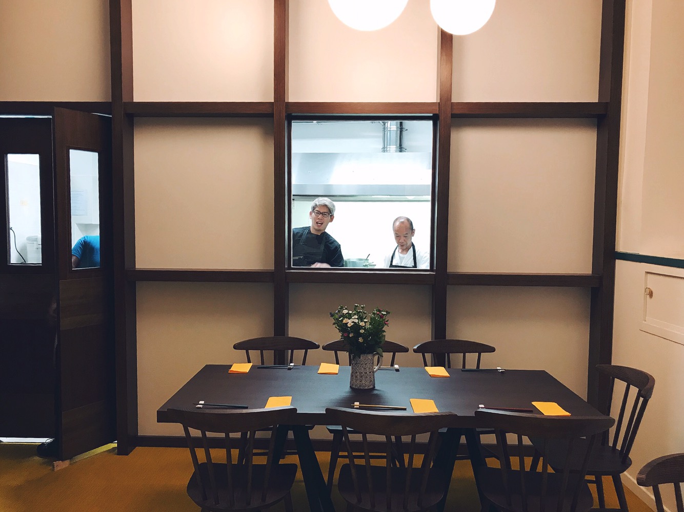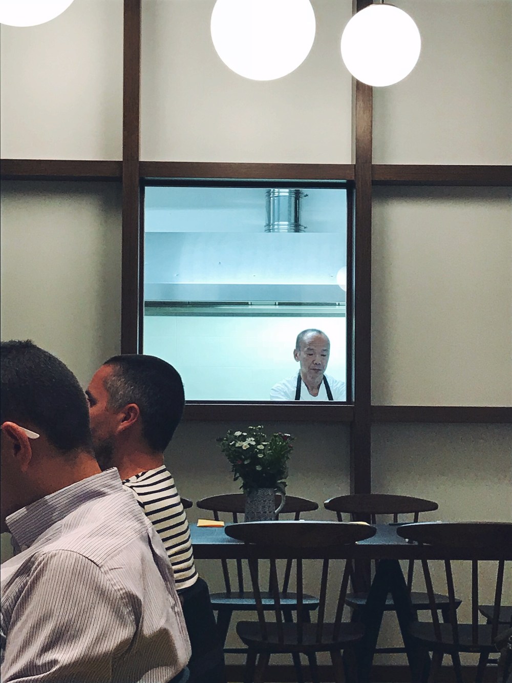 In fondo una finestrella dove si vedono il Maestro Masumoto San e il suo Sous-chef Himeno San all’opera.