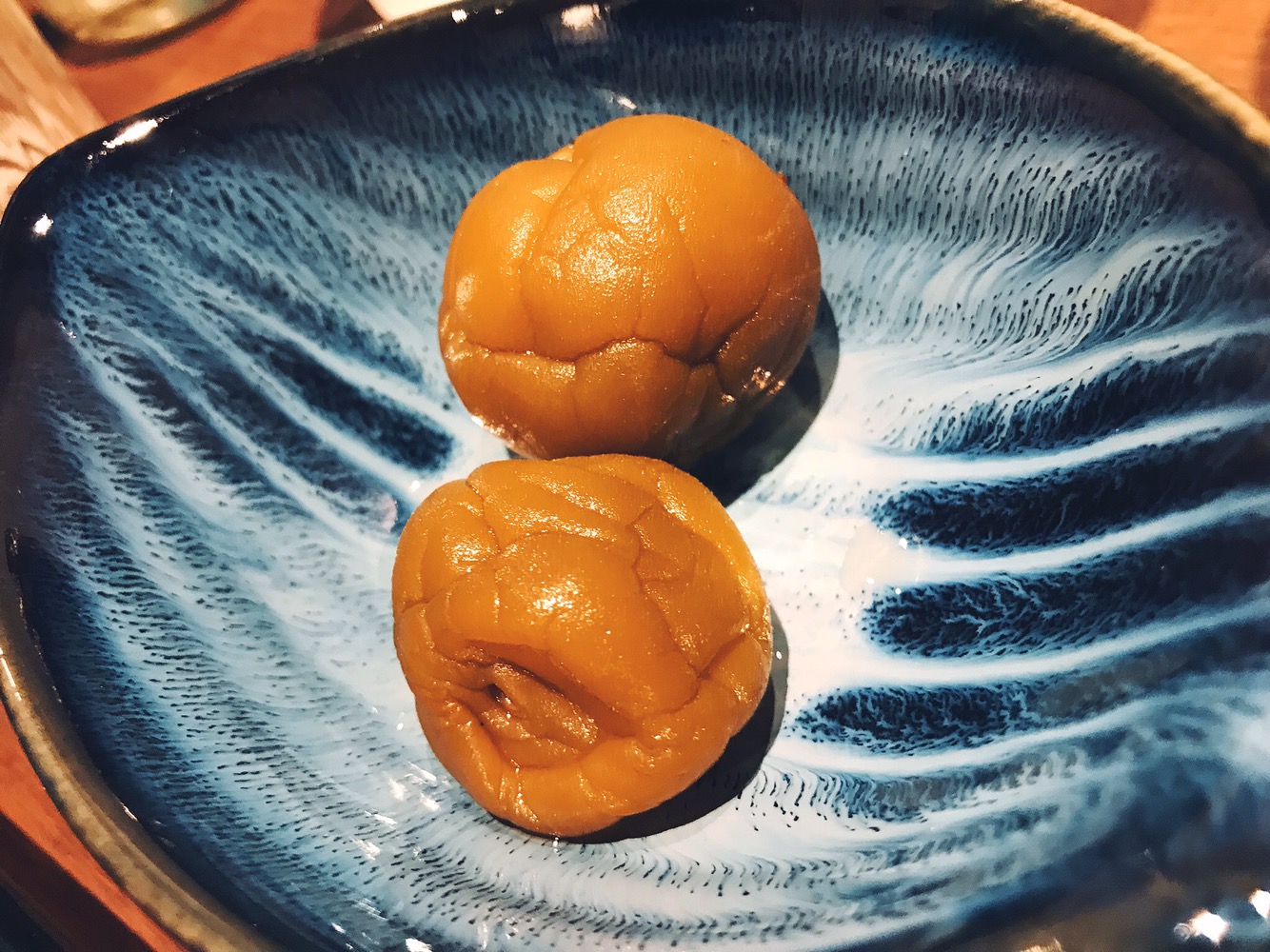 Mentre ci viene servito al tavolo, Takara San ci spiega ancora una volta in modo molto preciso, tutte le sue particolarità e curiosità. L’umeshu è davvero troppo buono e dissetante (in Giappone infatti viene bevuto soprattutto nelle stagioni più calde). Il sommelier preleva addirittura due prugne Ume che sono in ammollo nella bottiglia e ce le fa assaggiare, facendoci apprezzare ancora di più questo liquore.