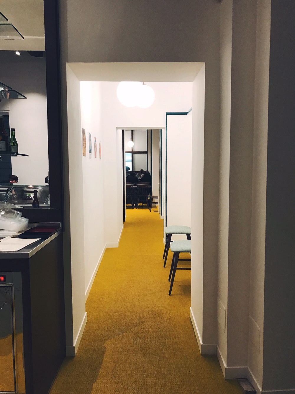 L’impatto con l’arredamento è destabilizzante e unico nel panorama milanese. Il pavimento giallo simile al Tatami, le pareti bianche e lo stile minimale rimandano ad un’idea moderna di Giappone e a un’atmosfera intima e culturale.