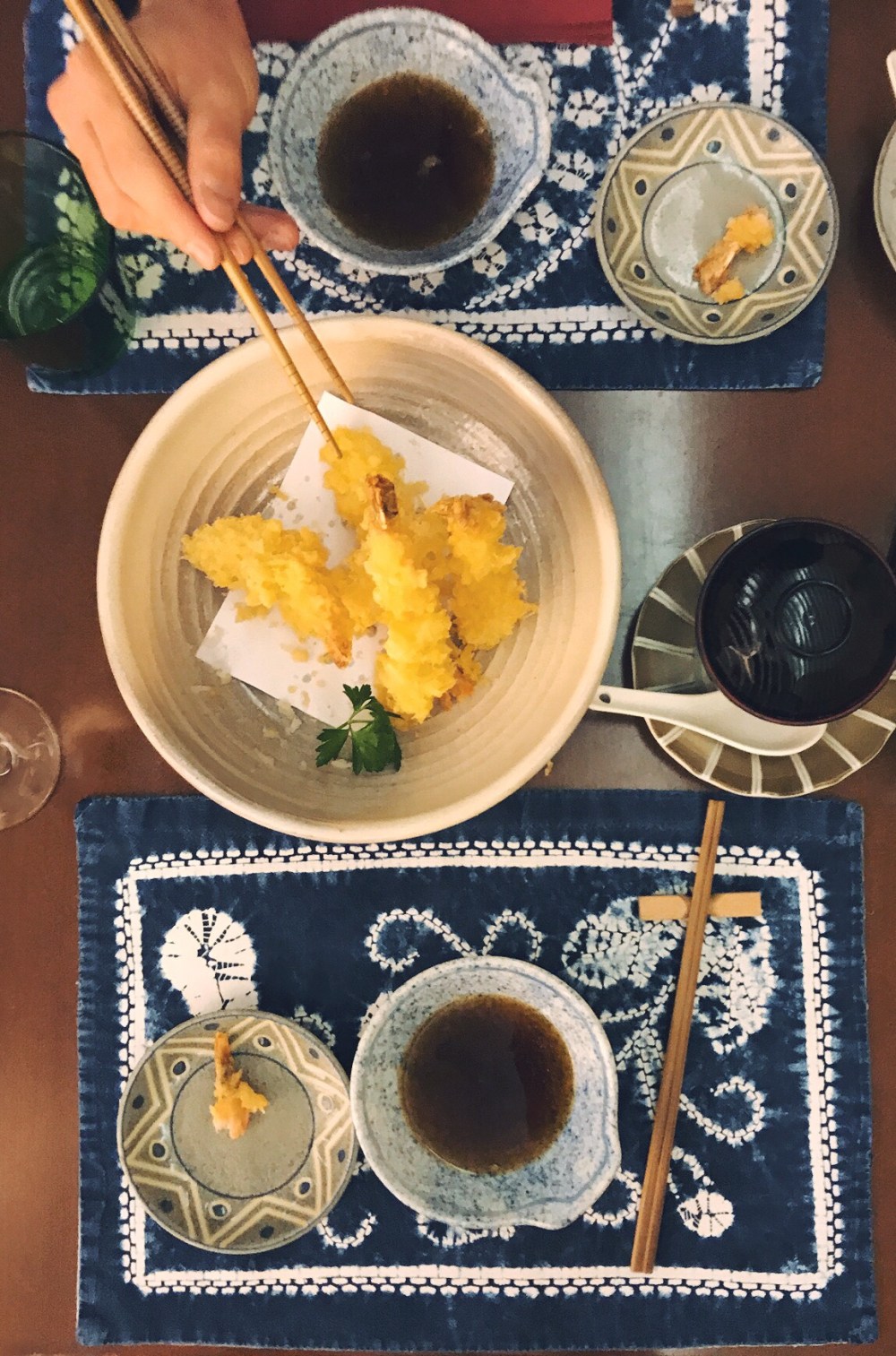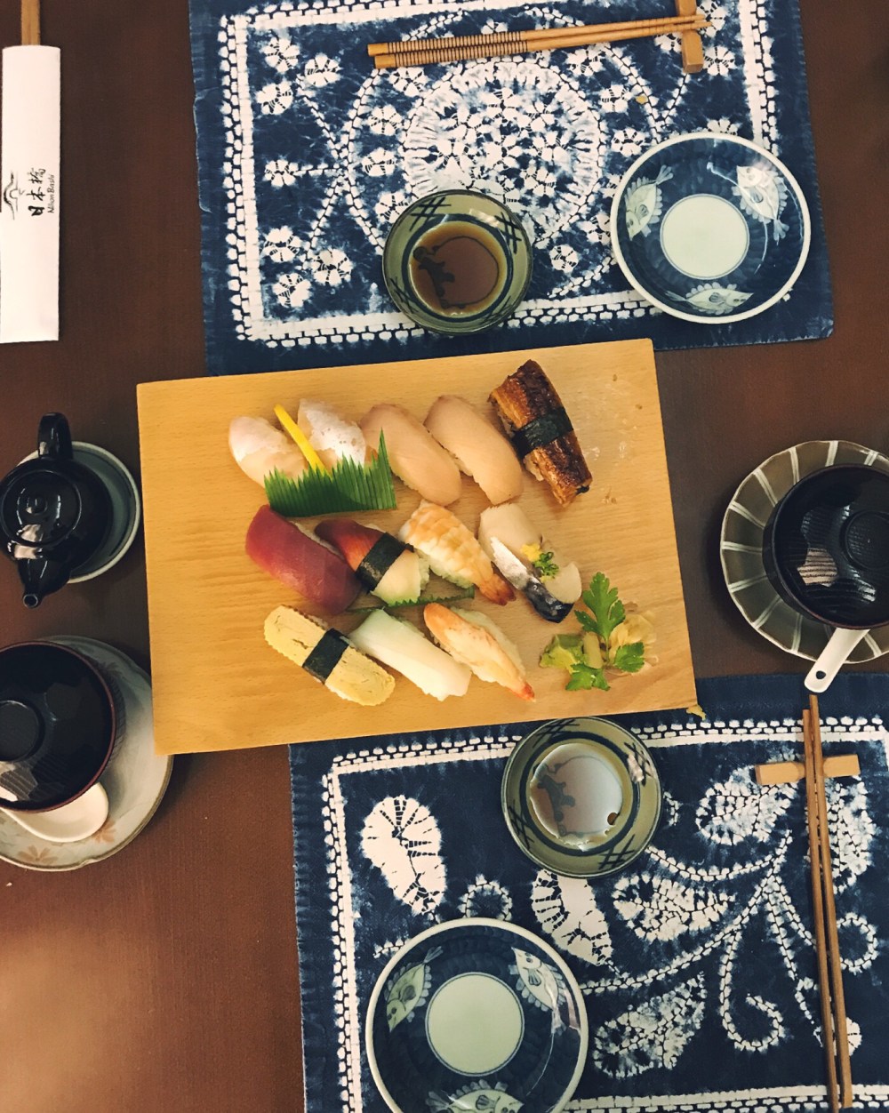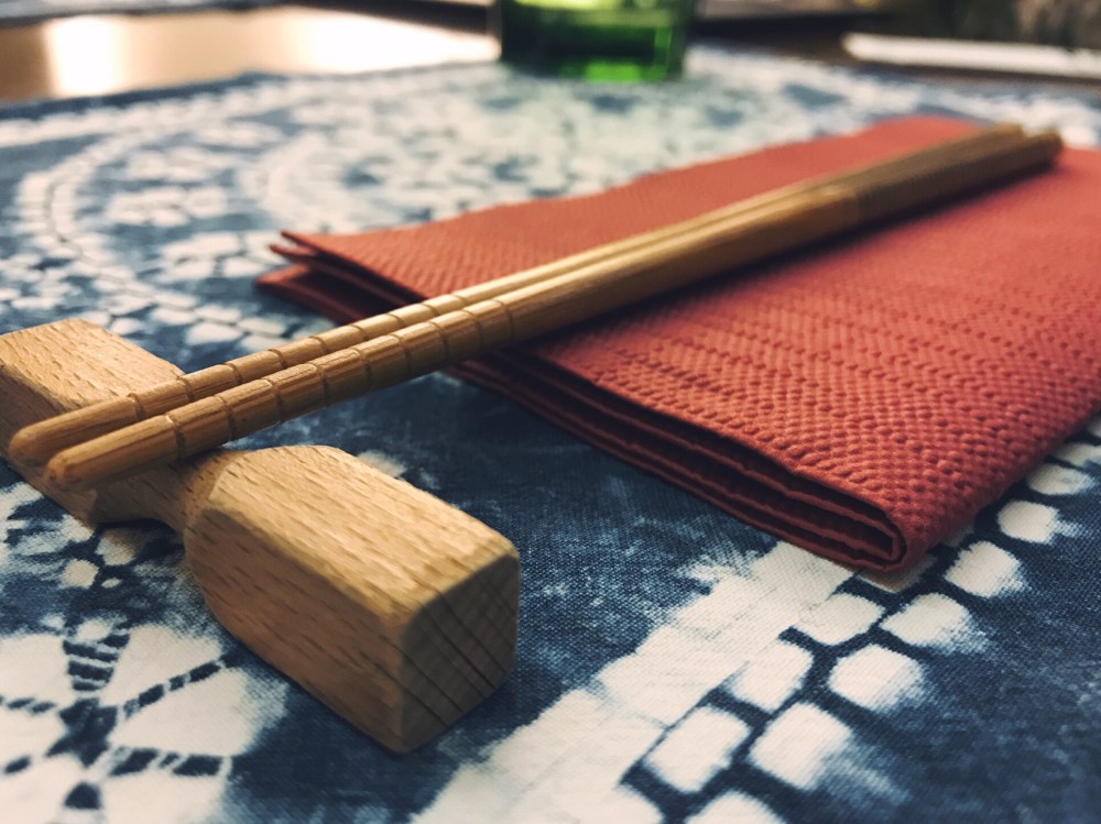 La tavola é molto carina, apparecchiata con una tovaglietta blu e hashi di legno.
