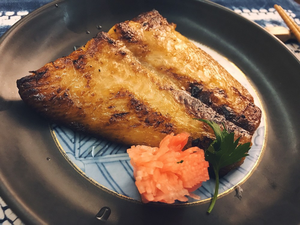 Il pesce viene lasciato marinare per giorni dentro sake, mirin, zucchero e miso e poi cotto al forno e in padella. Di solito con questo metodo viene cucinato il black cod (gindara). In questo caso invece è stato utilizzato l’Halibut, un pesce meno pregiato del primo ma che comunque risulta molto buono. Questo processo arricchisce il gusto delicato del pesce, dandogli un sapore deciso e molto appetitoso. In più la carne è morbida ma allo stesso tempo compatta.