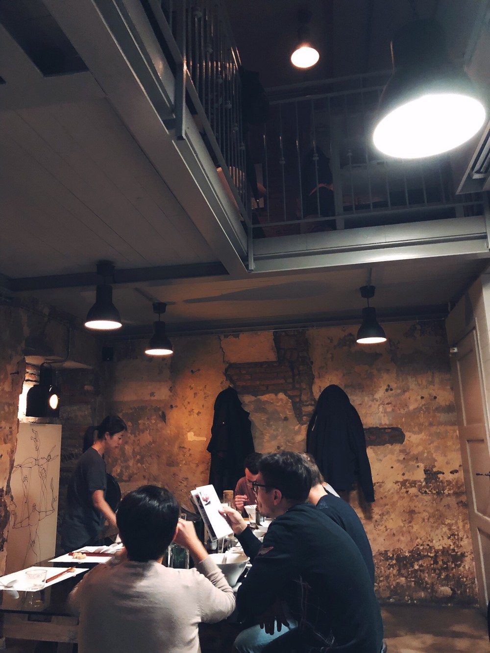 Il locale è molto piccolo, caratterizzato al piano terra da due “share table” dov’è possibile cenare di fianco ad altre persone; al piano superiore invece un piccolo soppalco con qualche tavolo.
