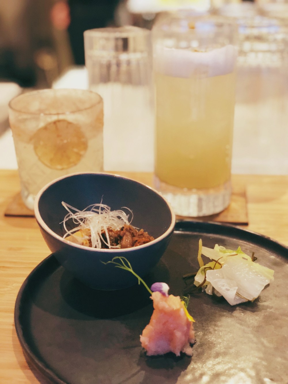 I cocktail vengono accompagnati da tre stuzzichini molto interessanti serviti in un piatto nero per risaltarne i colori, descritti direttamente da Jun San, chef di Kanpai, e da Enrico.
