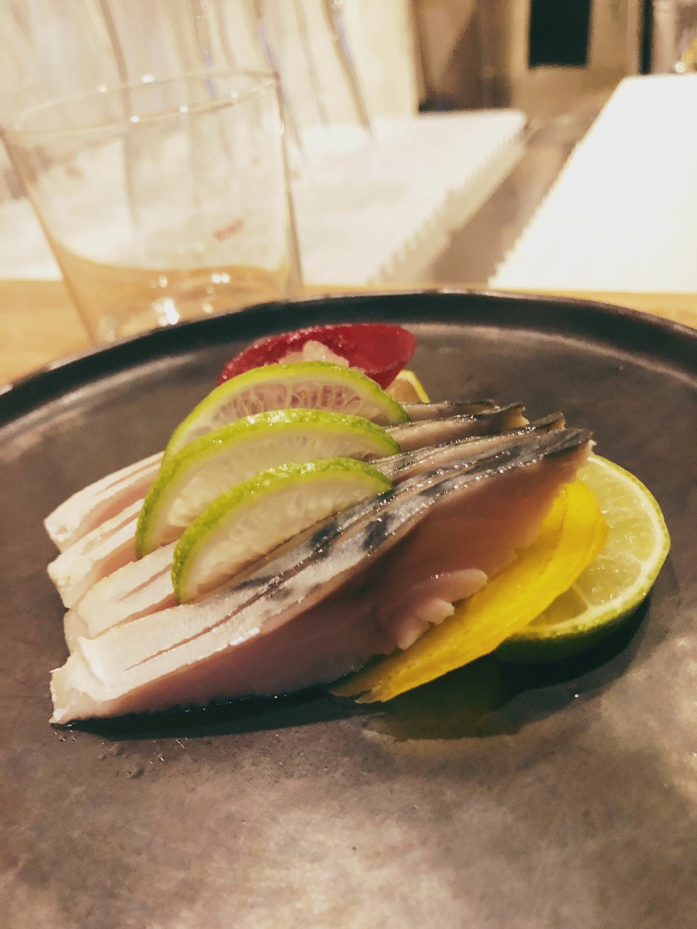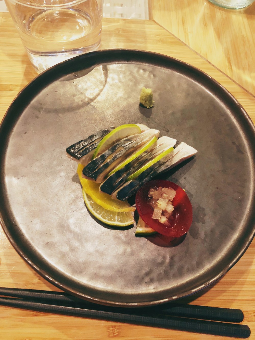 Il nostro percorso quindi incomincia con lo Shimesaba, sgombro marinato in aceto di riso.
