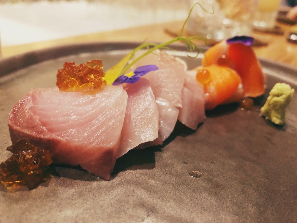 Disposti al centro del piatto Sashimi di Ricciola e di salmone selvaggio, accompagnati dal Tosatsu, un tipo di Gelatina di soia e Dashi.