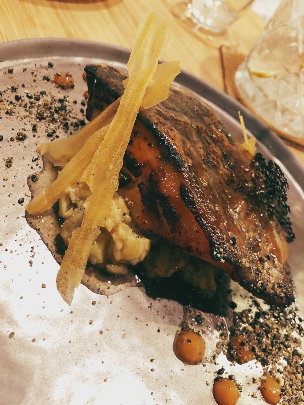 Viene presentato sopra lo Yakinasu, melanzana grigliata e affumicata e gocce di Su Miso. È molto interessante l’impiattamento perché differisce da quello tradizionale che vede il merluzzo nudo e crudo con la classica foglia alla base del piatto e uno tsukemono di guarnizione.