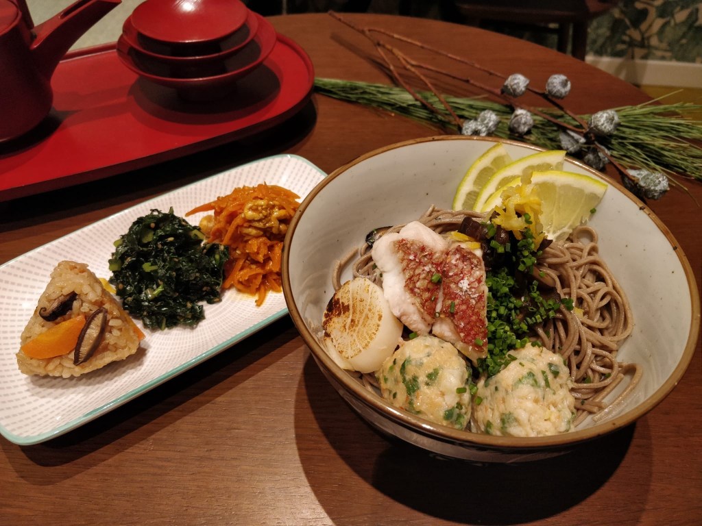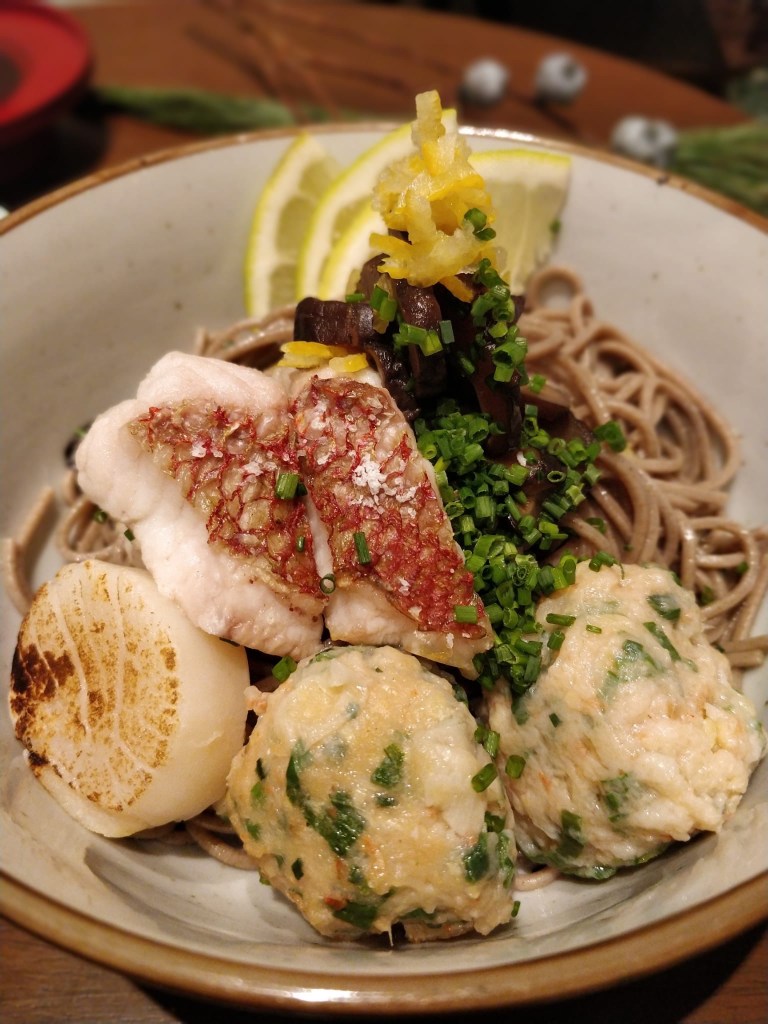 Solitamente questa soba viene servita con un brodo tiepido a base di soia. La variante della gastronomia Yamamoto si compone di pasta di grano saraceno accompagnate da polpette di gamberi con zenzero e cipollotti (i gamberi sono un simbolo di lunga vita!), il dentice (simboleggia un evento di buon auspicio), insieme a capesante, funghi shiitake, bergamotto fresco e una buonissima base di zuppa calda.