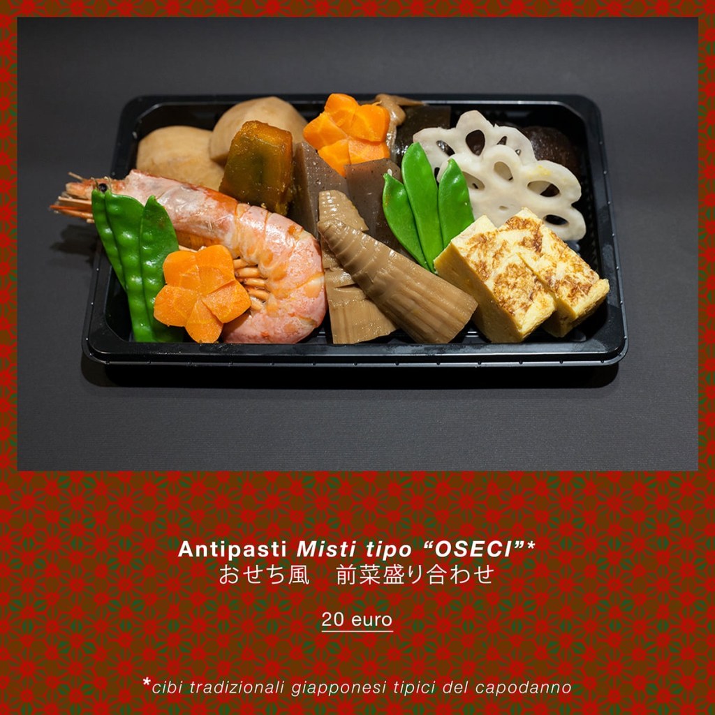 Il ristorante Oasi Giapponese propone un vero menu composto da Osechi di capodanno. Datemaki, kouhaku kahoko, tazukuri, kazunoko, kuromame sono solo alcune delle pietanze che potrete assaporare, tutte conservate in una scatola laccata.