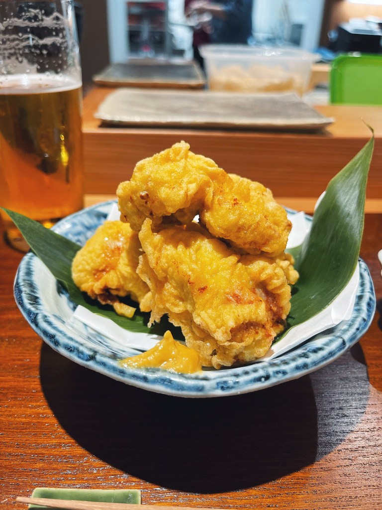 Dopo aver ordinato del sake e una birra partiamo con l’ordinare il Toriten, una novità assoluta. Si tratta di una prelibatezza della Prefettura di Ōita (zona originaria di Ninomiya San) che abbiamo mangiato per la prima volta a Beppū, all’interno dell’Umi Jigoku (uno dei famosi inferni).