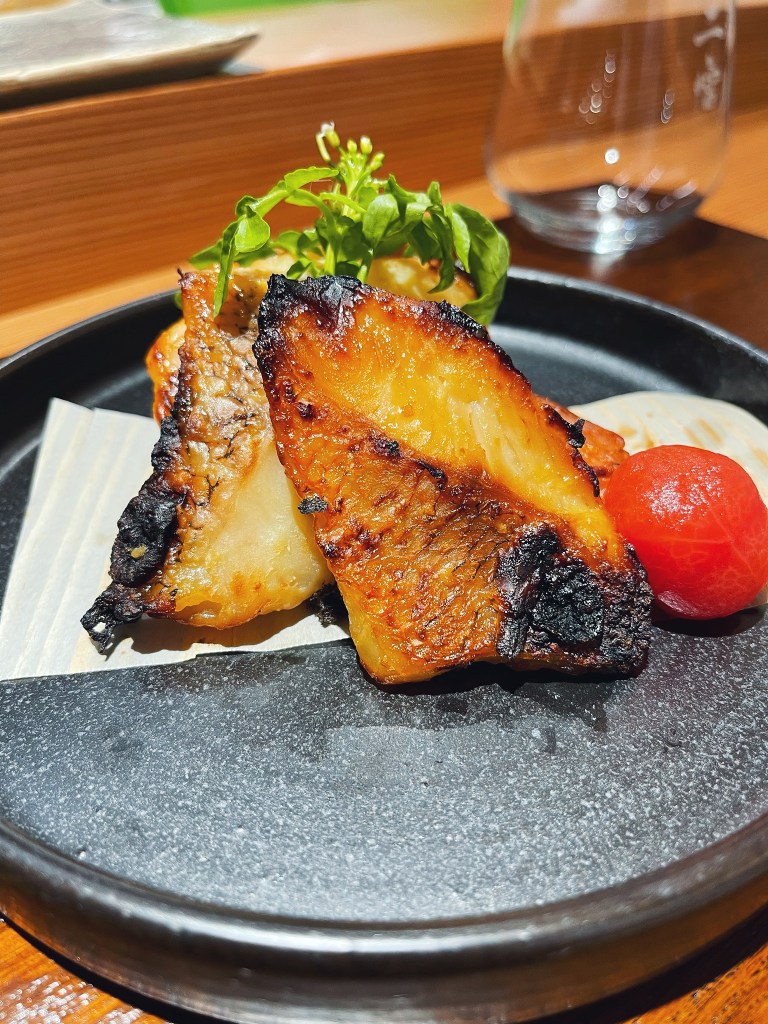 Passiamo ad uno yakimono: Kasago no saikyozuke, fettina di scorfano marinata in una salsa al miso e poi grigliato.