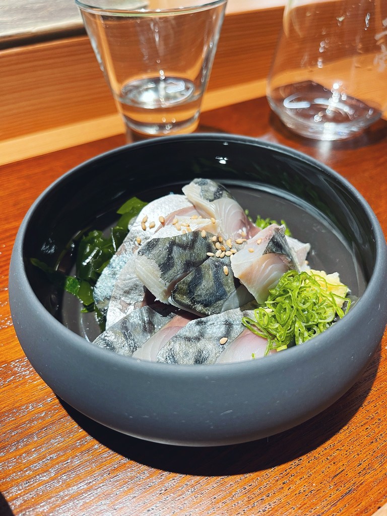 Dal menu di Fukurou ritroviamo il nostro amato Shimesaba no nadaae, sgombro marinato sottaceto in riduzione di sake, da abbinare alla salsa di soia.