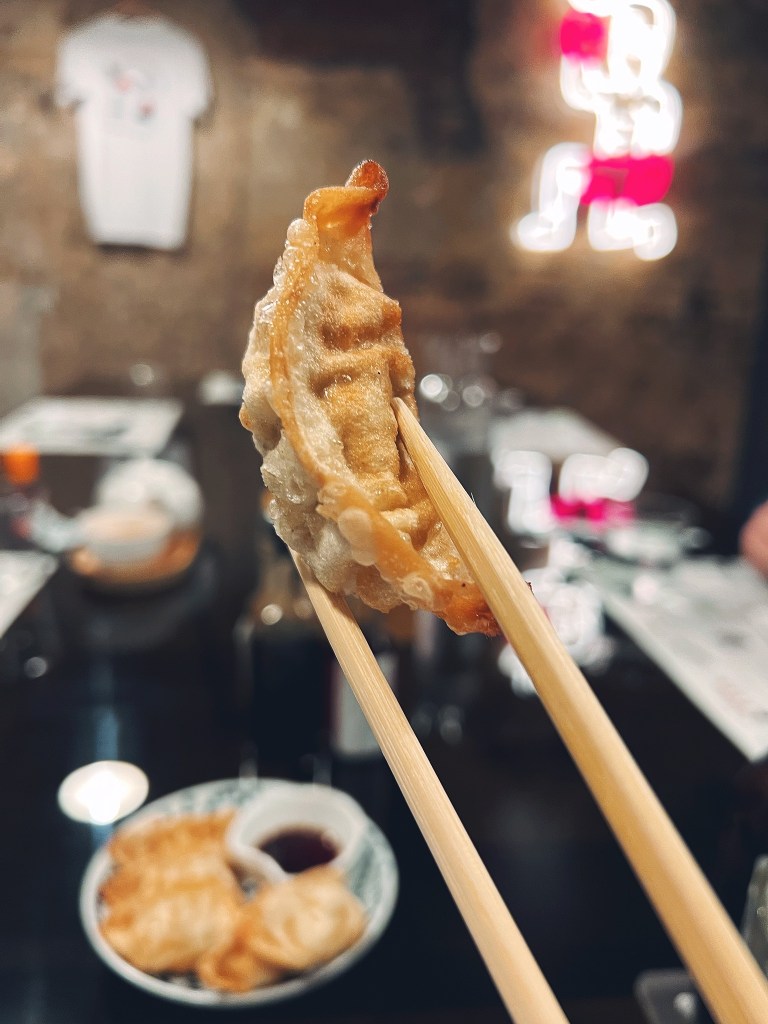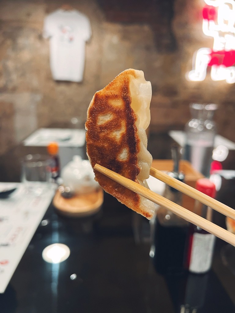 Partiamo coi Gyoza, ravioli fatti a mano ripieni di maiale, funghi shiitake, verza, cavolo cinese, aglio, zenzero, brodi di pollo. Li abbiamo assaggiati in due varianti: